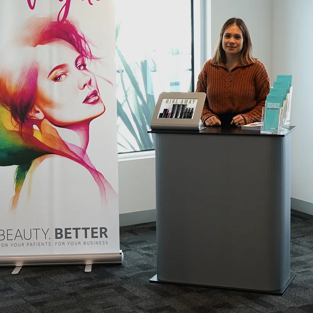 This trade show display counter can be used in different businesses to make interactions with guests and potential clients easy. The 895mm tall display has a large 820 x 402mm top counter that is perfect for placing iPad holders to check in guests, brochure displays that provide take away information, or a place to have employees interact with guests as they enter a location. The 50kg weight limit allows a large number of different items to be displayed without issue, making this display stand perfect for retail stores, shopping centres, exhibition halls, expos, in store events, and more.