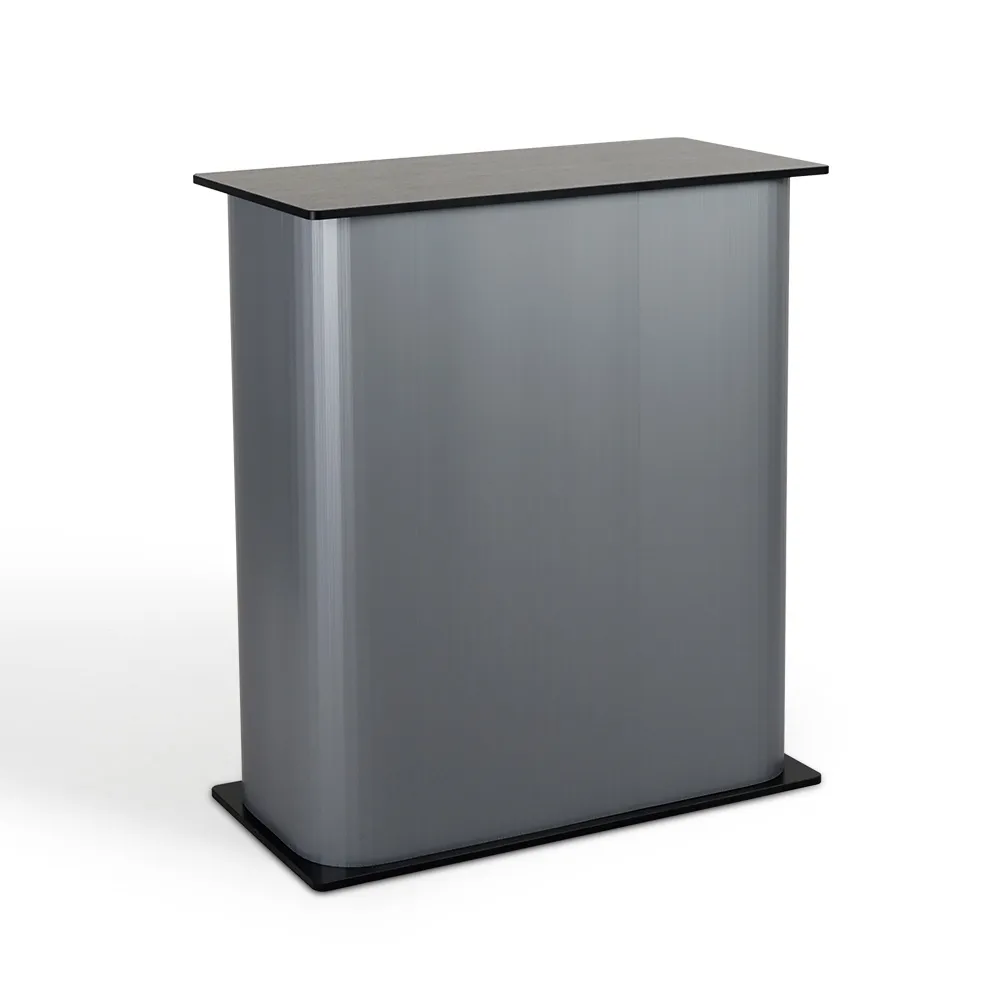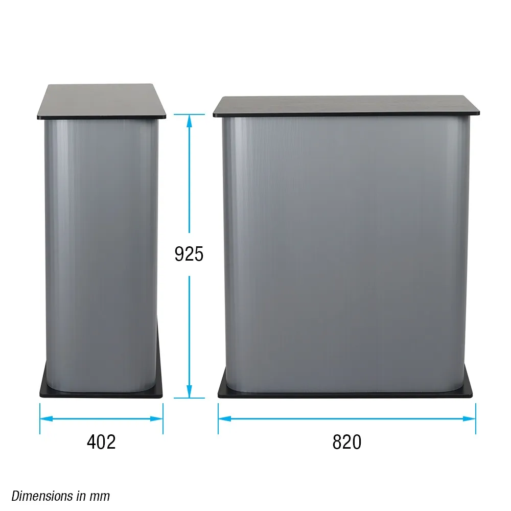 A trade show display counter, like exhibition counters and portable displays, requires no tools for quick set-up that's perfect for bringing to events. The heavy duty grey plastic wrap uses Velcro to attach to the base and countertop in under one minute. The back of the unit has a 285 x 895mm opening to allow interior access, ideal for placement of additional stock or personal items that you wish to be kept out of sight. The portable unit has carrying bags included for all components as well to make transport between events or storage when not in use simple.