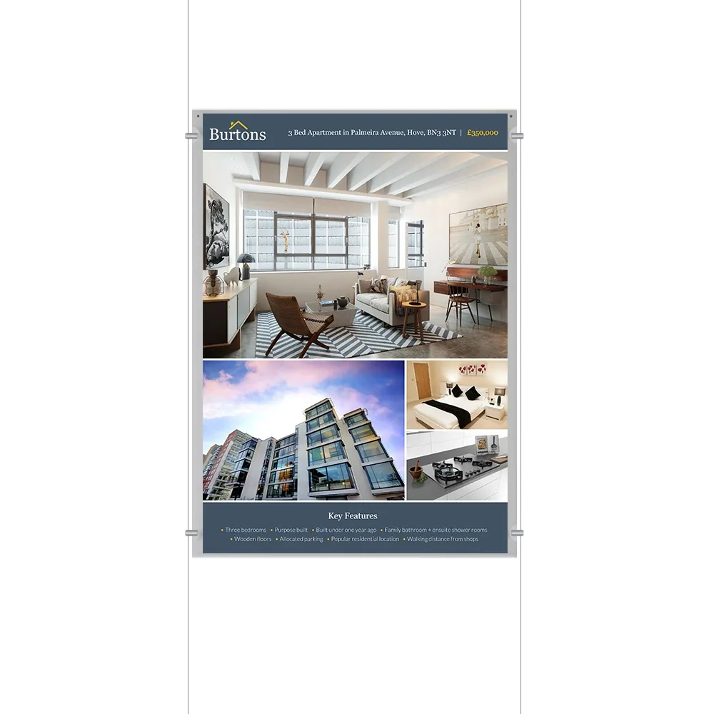 These cable signs are made from acrylic to show the entirety of your custom graphics. These hanging acrylic signs are available in different sizes to suit the exact needs of customers. The cable signs can be purchased in A1, A2, A3, or A4 sizes. These hanging signs make changing out graphics a simple process. The acrylic is pulled part, replace the graphic, and let the acrylic come back together! These hanging acrylic frames, cable signs require no tools when replacing posters. The different sizes also allow customers to create unique displays with a combination of sizes.