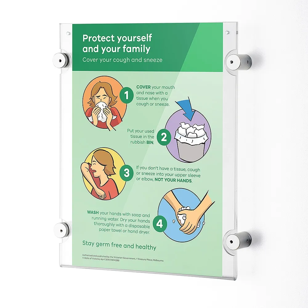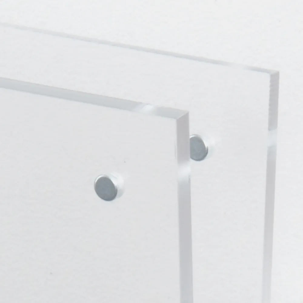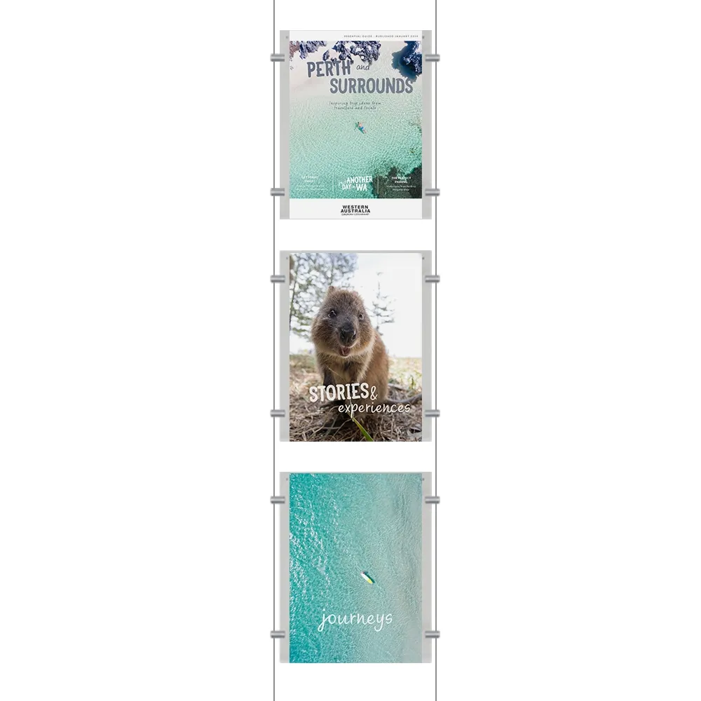 Use this acrylic poster frame with your hanging cable system to display posters on two sides to maximise visibility! The holder is made from 3mm thick clear acrylic that have cut-outs to easily cable system standoffs whilst providing a full view of posters. This frame is designed to hold A4 (210 x 297mm) posters in portrait orientation on each side, using a slide-in design to allow for simple changes with no tools needed. Button magnets are embedded within the clear plastic to keep the frame from flopping open whilst keeping your posters in position. Order online by 3pm AEST to receive same day shipping to anywhere in Australia, only from Slimline Warehouse!