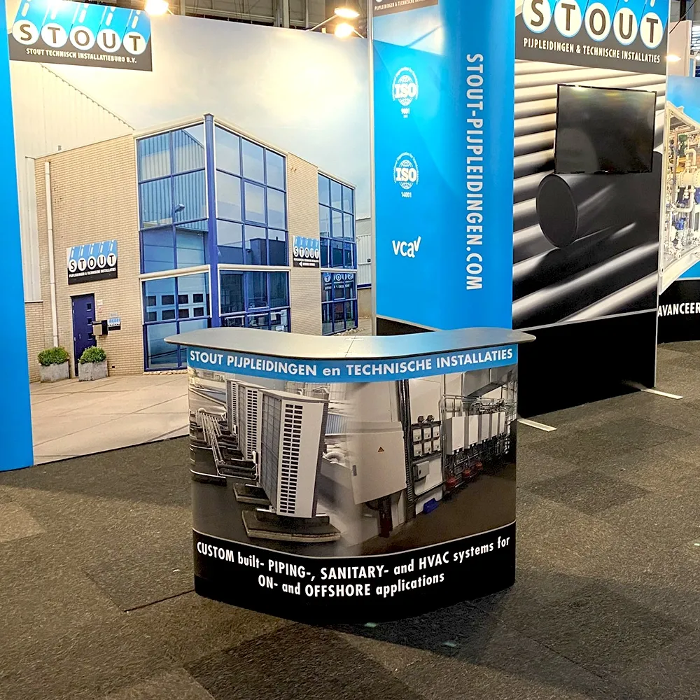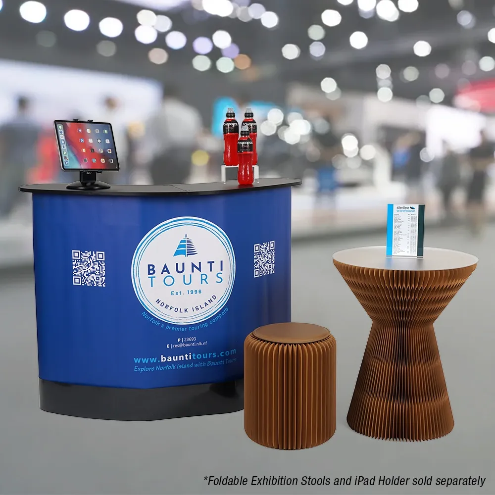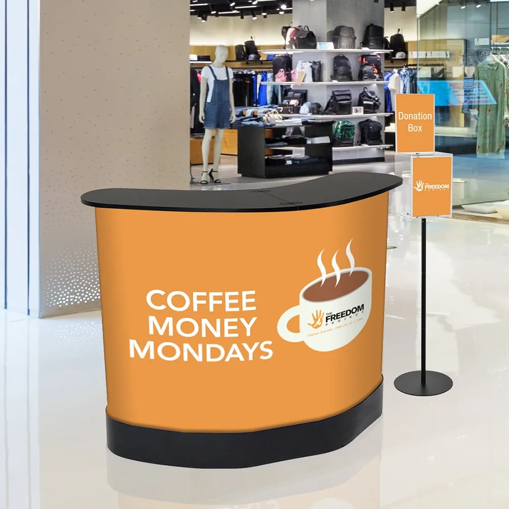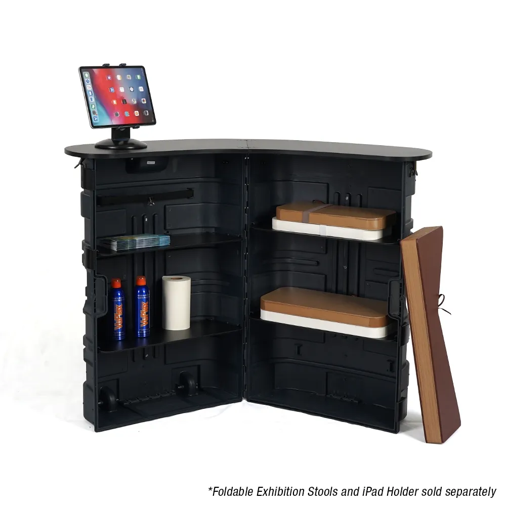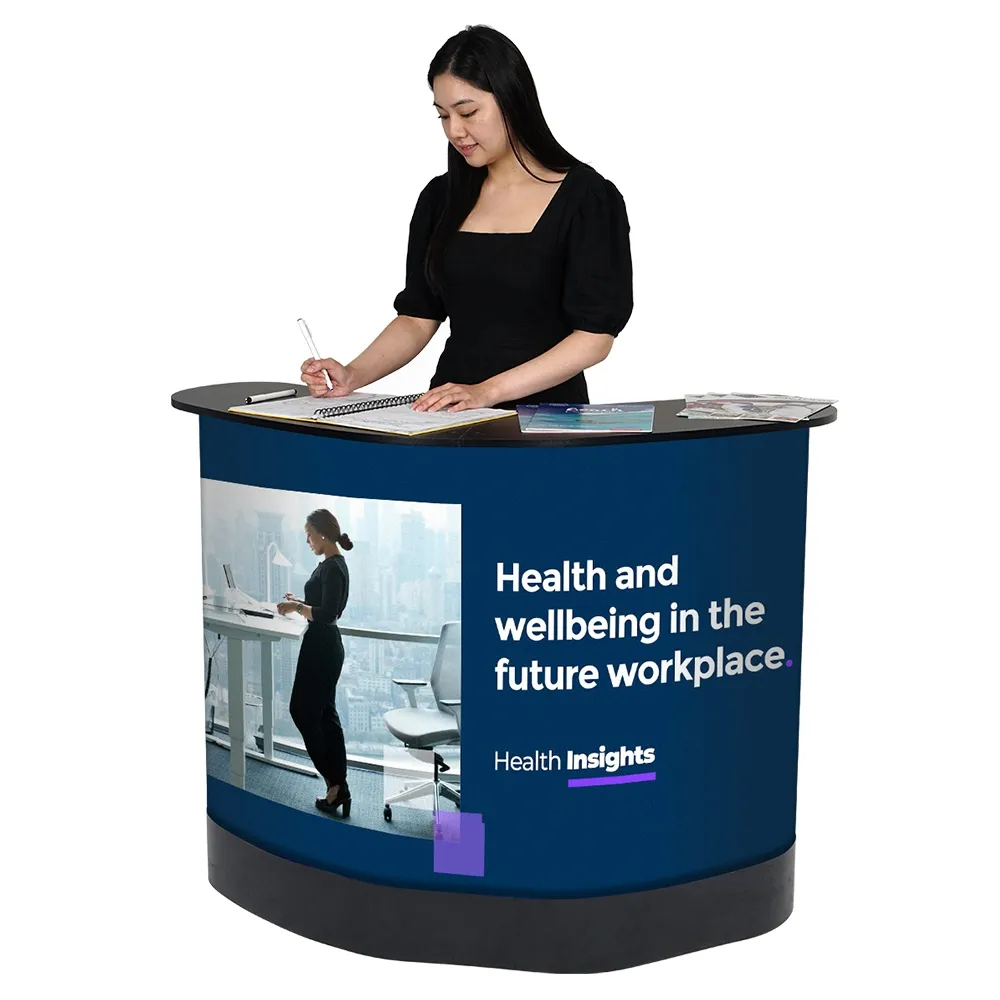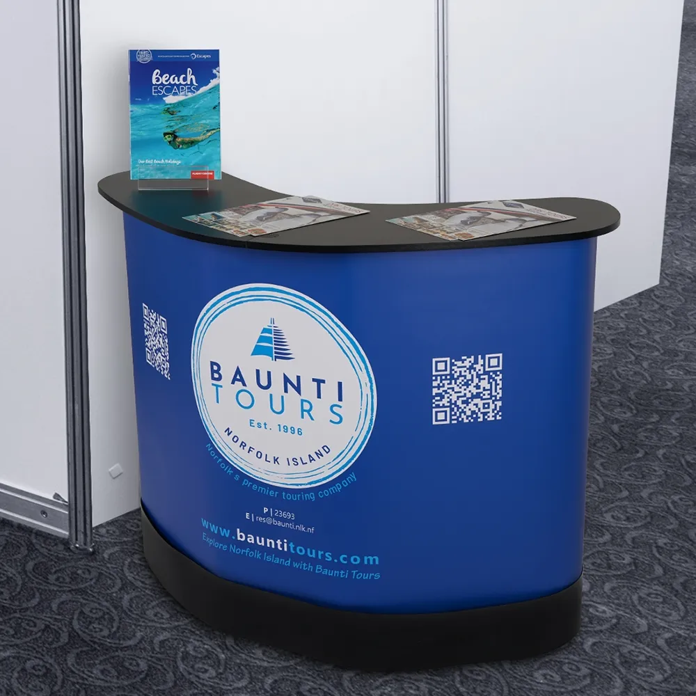 A rolling trade show case makes bringing items to and from events safely a simple task, with this 2-in-1 unit providing a full-on counter once at the location to share your wares and greet passersby! The portable exhibition counter has a custom printed vinyl wrap that goes fully around the front of the case, showcasing your logos and branding to help get potential customers interested. A digital printing process ensures full colours, rich imagery, and a true to depiction representation of your graphics to best fulfill your needs. If you need help with designing the wrap, our in-house teams offers three tiers of assistance to help you get a complete product for your next event. Additional graphics are available for purchase separately as well, allowing you to have updated logos or branding or market towards clients at a specific event without having to purchase an entire new kit!