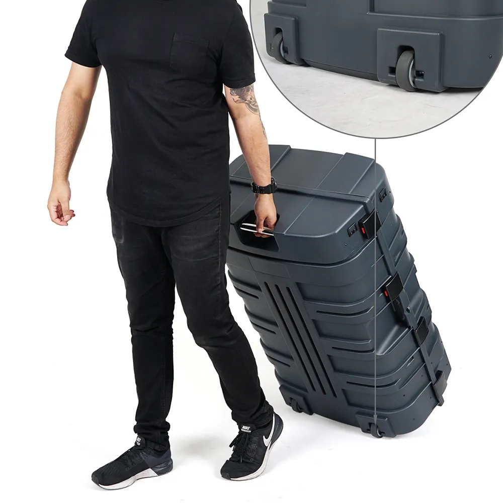 - ABS plastic hard shell case has wheels and built-in handle to be easily transported between events