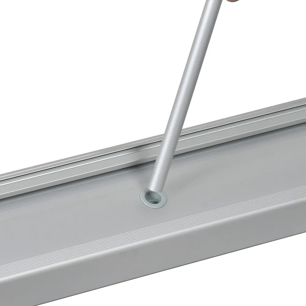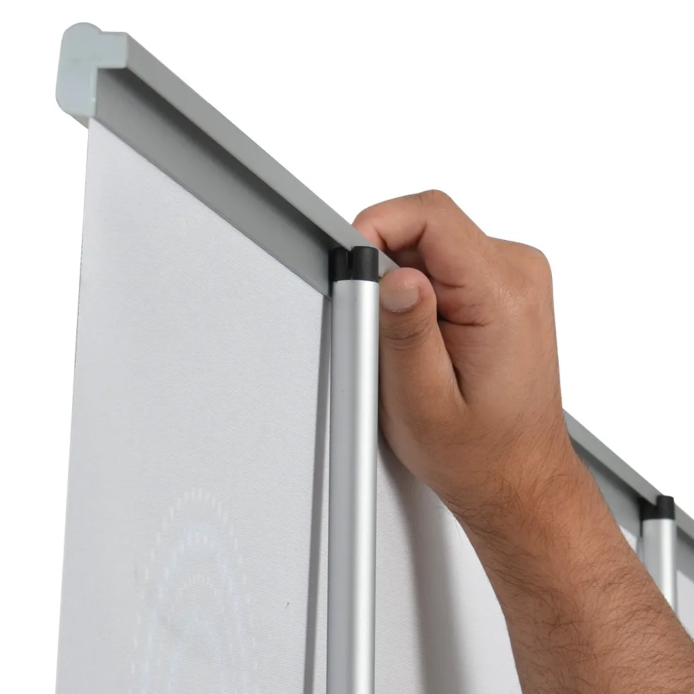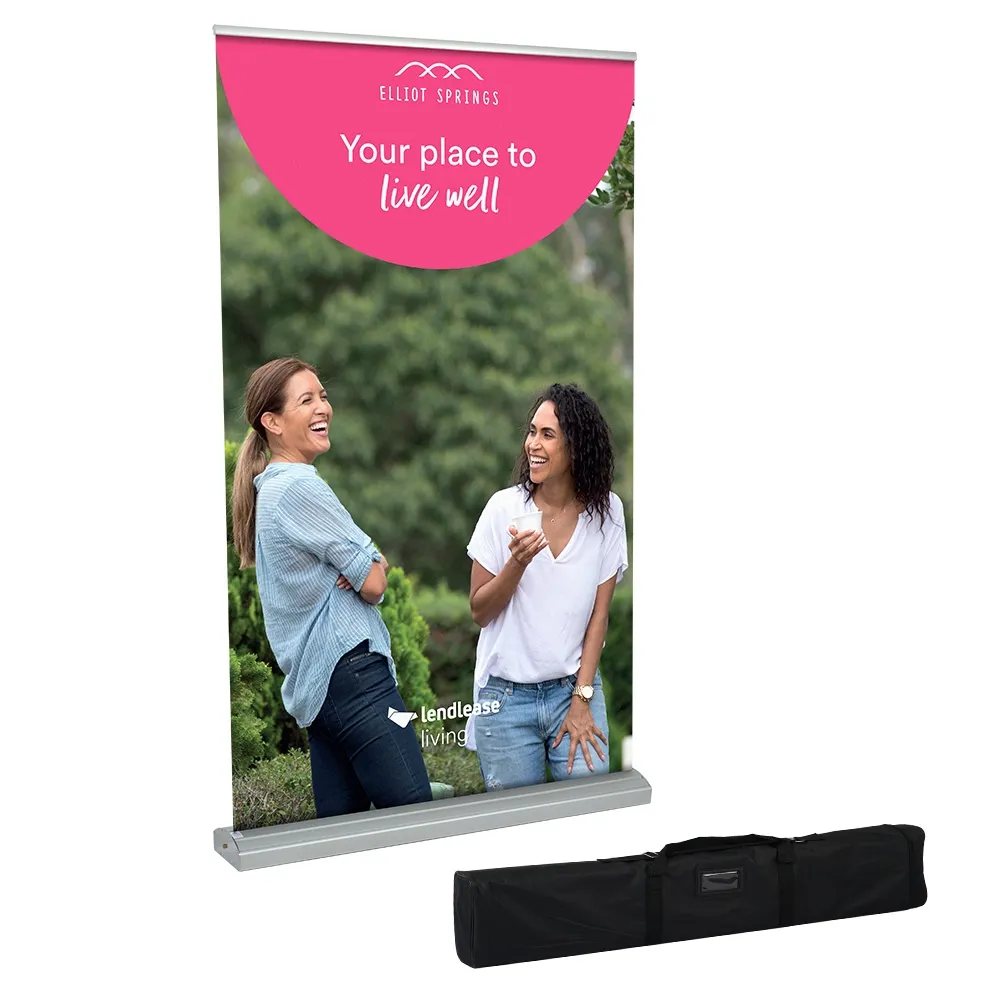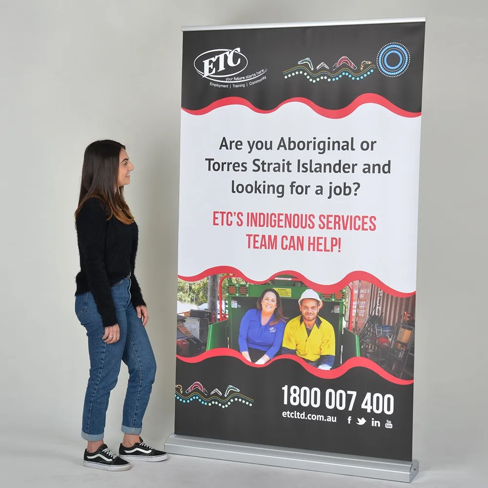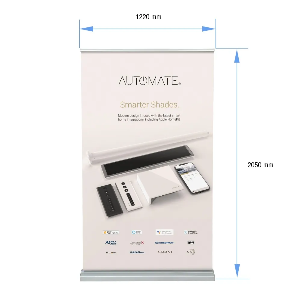 This banner is manufactured using quality extruded aluminium that has a clear anodised finish. We install the banner into the display stand so you can be displaying straight form the box!