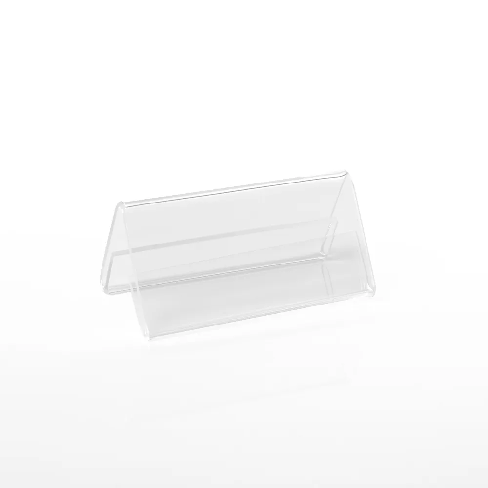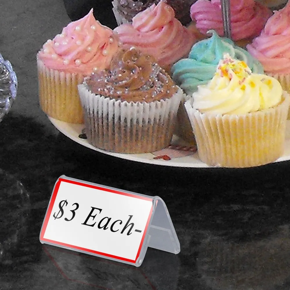 The clear plastic holder is designed to hold 60 x 30mm graphics in landscape orientation, making them the perfect addition to many marketing efforts. The angled display is set to make it easier for passersby to read, and the small size makes these perfect for use in many different locations, including bakeries, cafes, and wedding reception halls.