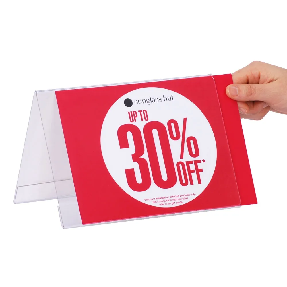 The acrylic sign holders are a dual-sided display that maximises exposure in any location without taking up additional counter or floor space! These signage stands are made from 1.5mm thick acrylic for durability, with the clear plastic helping ensure signs are easily read during use. Signage is also kept free or grime or dust during display.