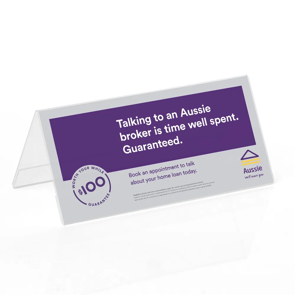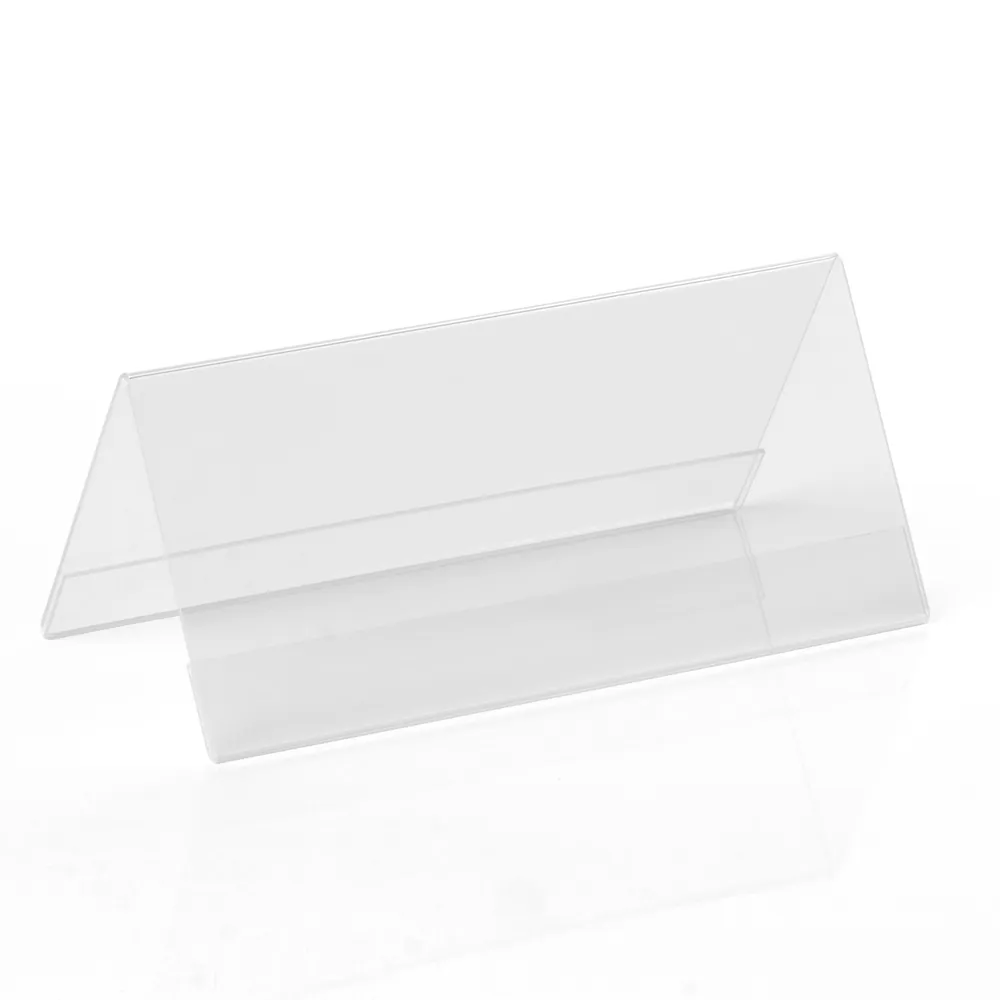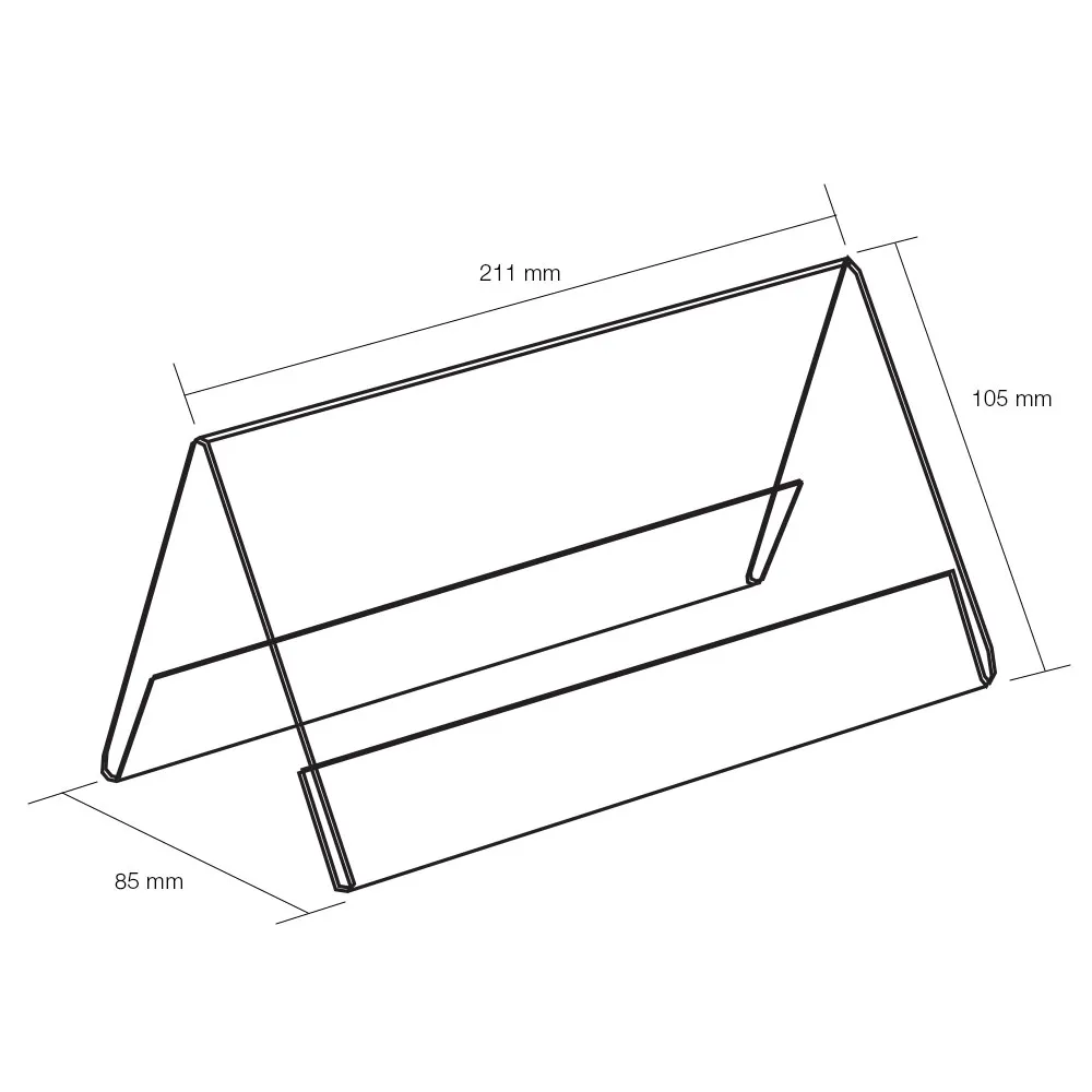 The clear acrylic stand, plastic display holds a DL (210 x 99mm) custom graphic in landscape orientation. The dual-sided display is able to hold (2) of this size graphics, and allows you to advertise in multiple directions at once with the small footprint display taking up little room on a table or counter-top!