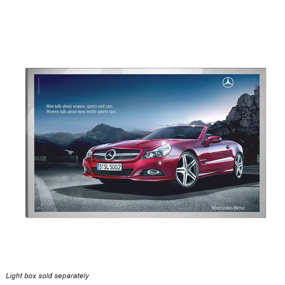Backlit printing offers a striking poster that has your custom designs digitally printed in full colour with rich imagery! The poster is a 1731 x 831 translucent film that works with poster lightboxes and totems that are typically displayed in retail stores, cinemas, shopping centres, museums, casinos, information centres, airports, and more. A digital printing process is used to have your graphics placed on the transparent film, which when placed in a lightbox is beautifully illuminated to better draw the attention of passersby. If design assistance is needed, our in-house teams of experts is available, offering three tiers of help in order to best serve your needs. Order digitally printed graphics today from Slimline Warehouse to have quick delivery of top quality products to anywhere in Australia!