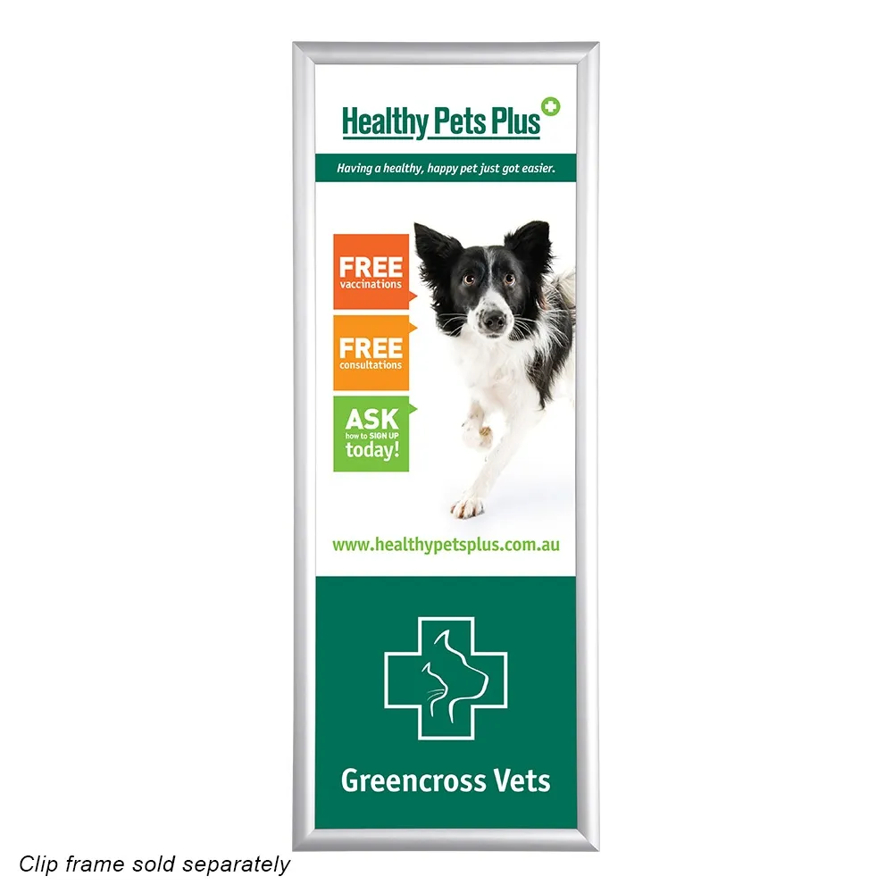 This poster has your designs digitally printed in full colour to offer an eye-catching promotional tool suitable for clip frames, slide-in frames, hanging rails and more. The poster is 841 x 297mm and made from 220gsm paper to offer an almost card stock thickness for better durability, with a satin finish for a truly professional look. If design help is needed, we have an in-house team of graphic designers available, offering three tiers of assistance to meet different promotional poster needs. Order this custom printed poster online today for quick shipping to anywhere in Australia, only from Slimline Warehouse!