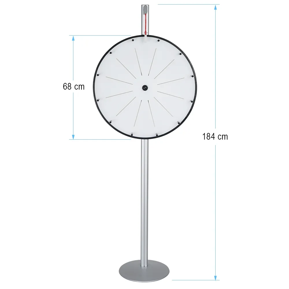 A promotional prize wheel, like trade show games, using a floor standing design so that it is easily seen whether in an exhibition booth, conference room, classroom, or retail store. The 1840mm tall unit has a 680mm wheel that is broken into (12) sections for writing individual prizes. This large surface makes it easy to write readable prizes on the spin the wheel game for all participants to see. The play to win game has a plastic flapper at the top as well that hits plastic pegs on the wheel as it spins for a loud clicking noise that helps to generate excitement and invite participation at different events!