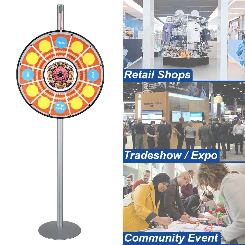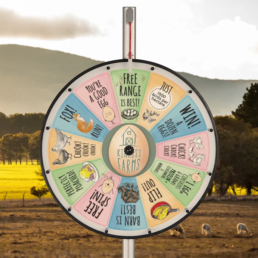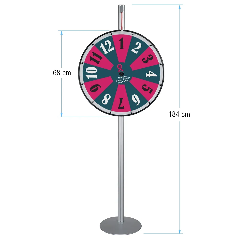 This large prize wheel is a floor standing unit that helps to add excitement any event, including at trade shows, corporate events, retail stores, or even in classroom and at birthday parties! The freestanding raffle wheel 1840mm tall and features 12 individual slots. Each slot features a custom printed graphic to display a wide variety of different offerings using colourful design that will surely capture attention! The entire vinyl graphic is applied at once, so unique designs can be used across the entire area to allow for an eye-catching look as the wheel spins! A digital printing process is used to ensure vivid colours and a true to design depiction. Contact our graphics department if assistance is required, with our design team offering (3) tiers of graphic help depending on your exact needs!