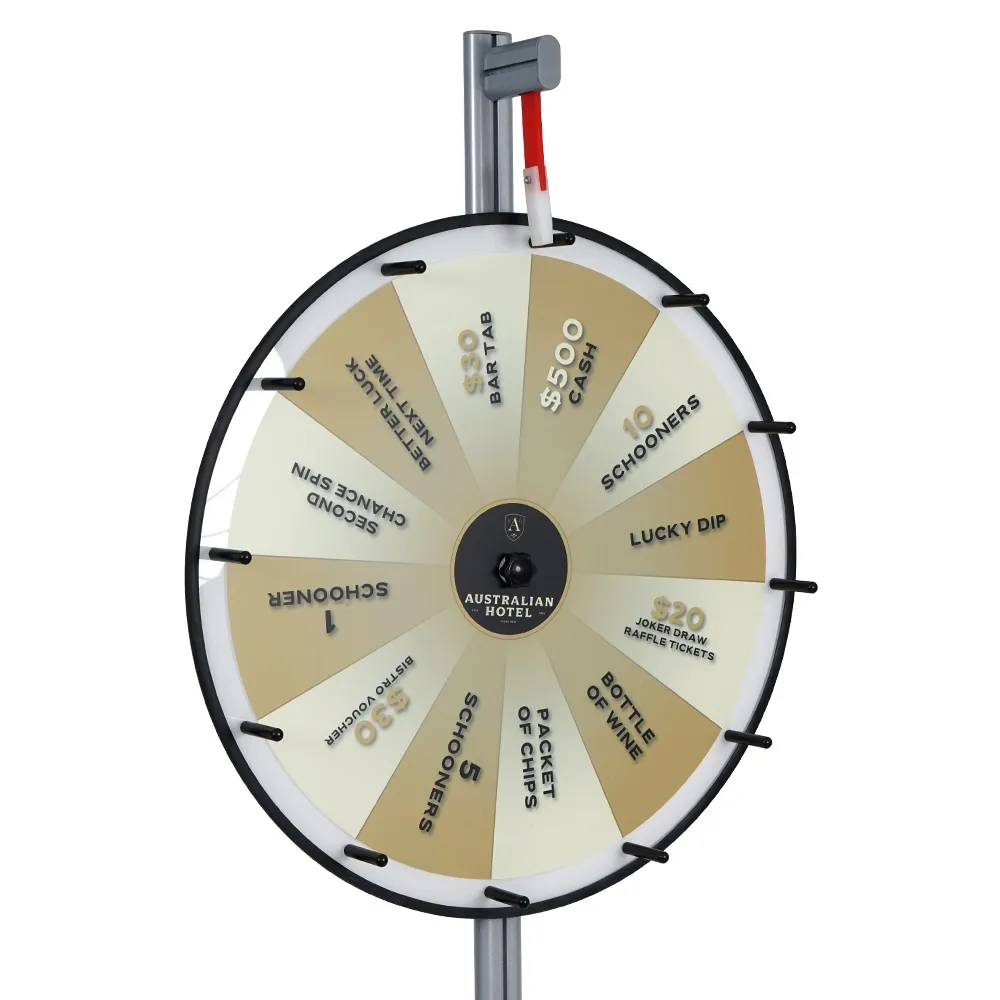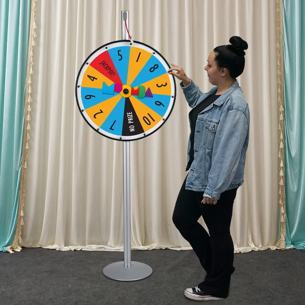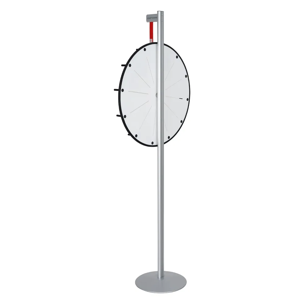 This large prize wheel, like many spinning game wheels, uses a large diameter wheel to make it easier to read different graphics. The 680mm wheel make it easy to see and allows the noisemaker to be louder as well. There are protruding pegs on each slot that the noisemaker hits against as the wheel is spun, helping to generate excitement. The base of the unit has a 360mm diameter and holds most of the 7.5kg of the display to help with overall unit stability. The centre pole has a modular design to allow for other accessories to be added, such as brochure holders or shelving to display prizes!