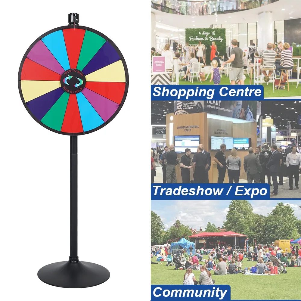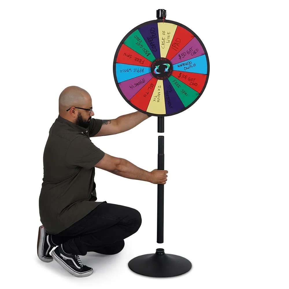 This prize wheel is a versatile display that can be placed on floors or atop tables to be used in any location as needed! The height adjustable design has a removable centre steel pole that securely attaches to the base with a thumb screw. This display is 1525mm tall when in floor standing position and 815mm tall if used on a table top. The 604 x 410mm base allows for other items, including available prizes, to be placed around when used atop a table and leaves plenty of room for users to spin the wheel when utilised in the freestanding mode.