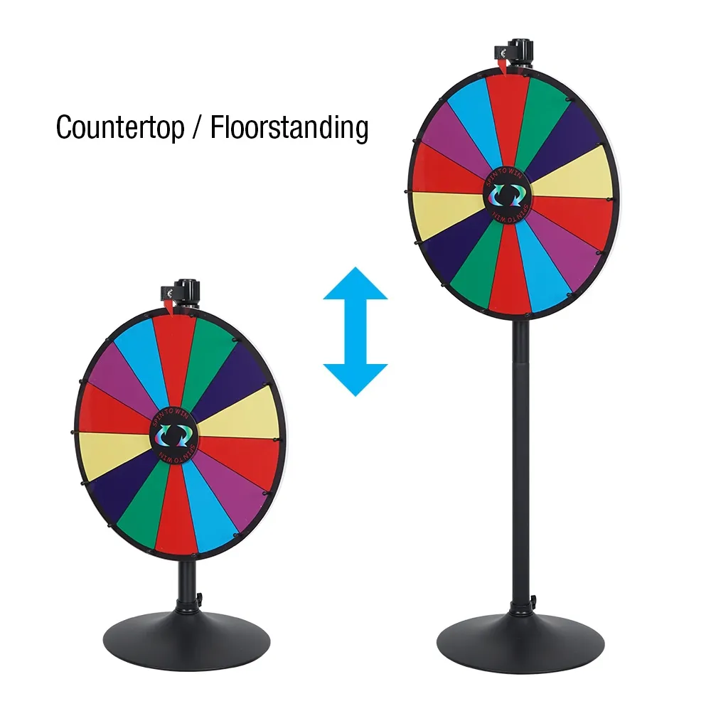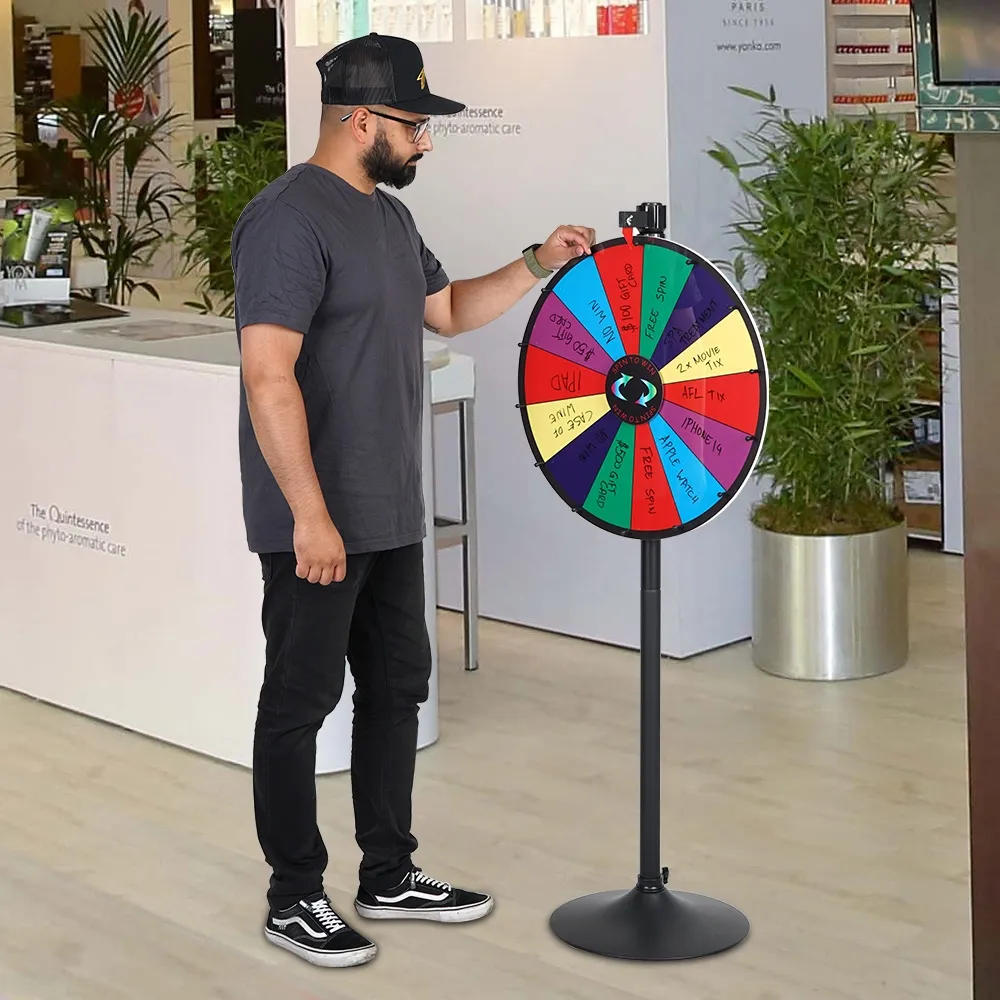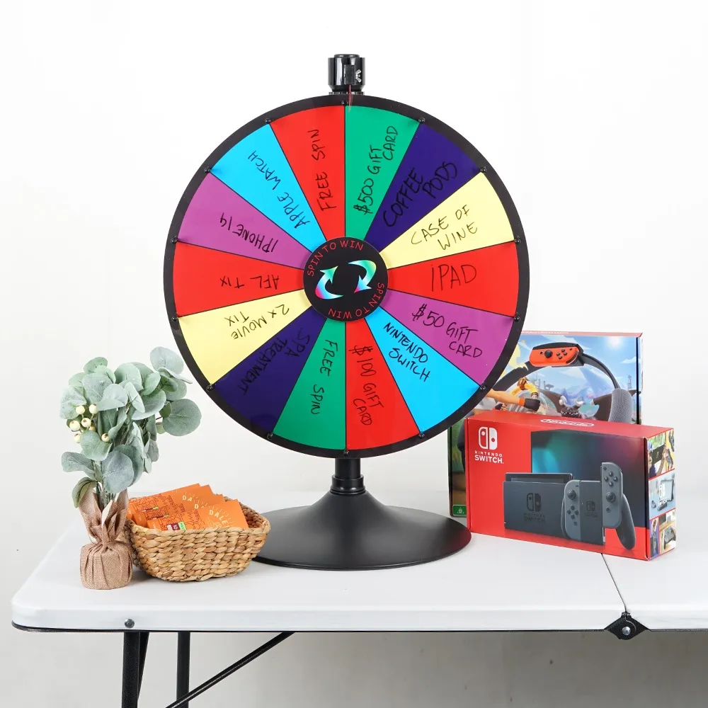 A prize wheel, like a spin and win game, has (14) different slots in multiple colours for writing available prizes. The acrylic slots are designed for use with a dry erase marker, making it easy to quickly right down prizes at events without having to print new forms and attach them! There is a dry erase marker and eraser included for easily writing and cleaning each spot. The centre of the board has curved colourful arrows and “Spin to Win” on a disc that, with the multiple coloured slots, creates an eye-catching effect whilst the wheel is spinning! There are protruding pegs that the red flexible arrow hits as it spins that creates noise that adds to the excitement and helps gets passersby interested. Use this style of raffle game in classrooms, retail stores, trade show booths, employee events, and more!