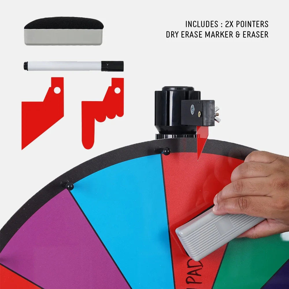 This wheel of prizes is used in many different settings to get people's attention and generate excitement, whether trying to entice students in the classroom, reward employees, or draw in potential clients. This prize game features a huge 91cm diameter wheel that is easily identifiable to get people interested in what is being offered. There are 18 individual slots on the board to offer a wide array of options that can be won. Dry erase markers are used to quickly create or switch the prizes based on what the wheel is being used for – no printing necessary!