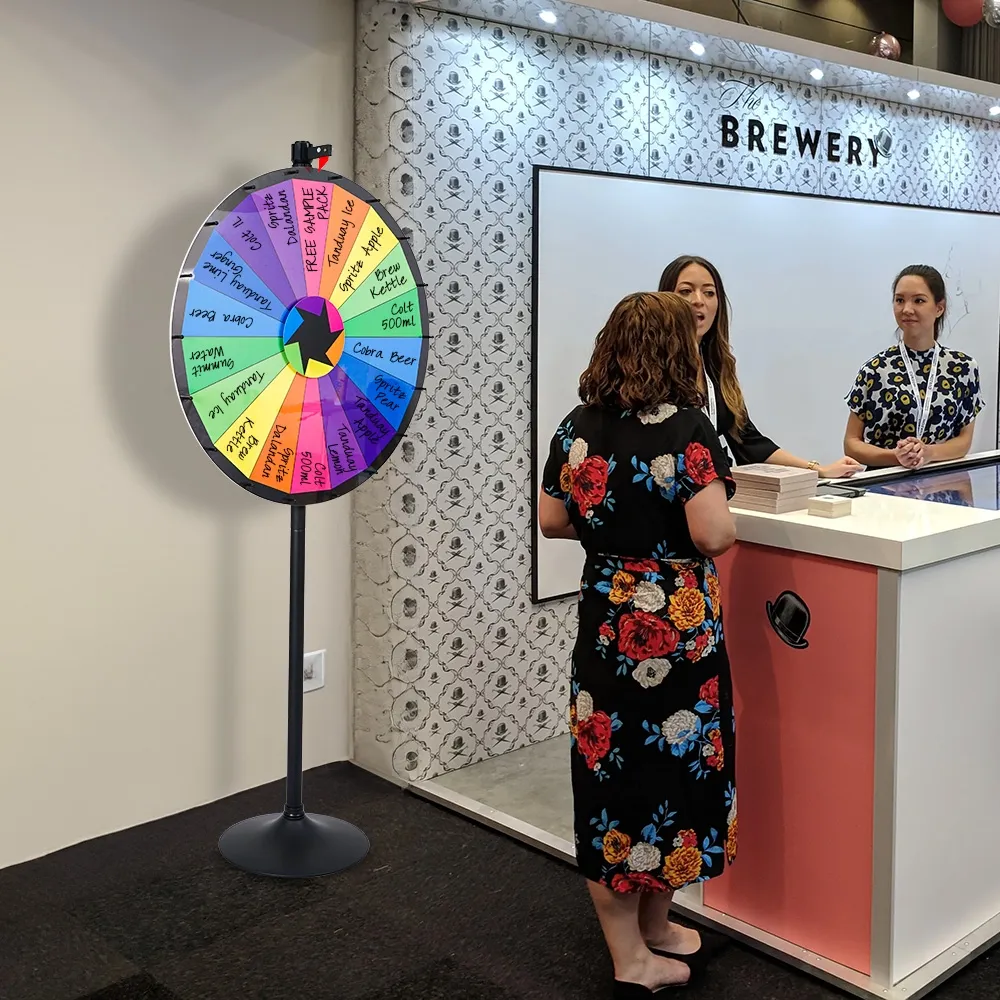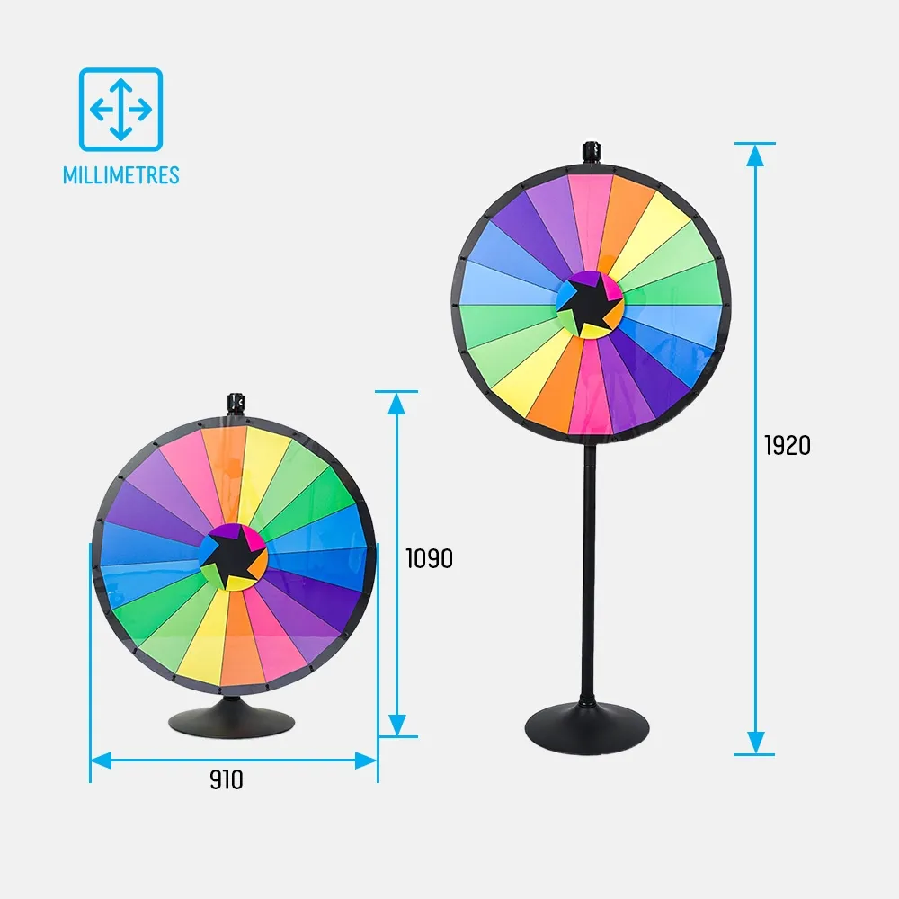 This spinning raffle game, wheel of prizes has a height adjustable design that allows for use on table or counter tops as well as a free standing display. This makes the game perfect for use in universities, trade shows halls, shopping centres, wineries, retail stores, carnivals, parties, team-building exercises, and heaps of other events. These prize wheels are 109cm tall at lowest position and can be raised up to 192cm when used as a floor standing unit to really grab the attention of passersby! The red pointer that denotes the winning prize makes a clacking noise against protruding rods as the wheel is spun, another way aside from the bright colours to help generate interest!