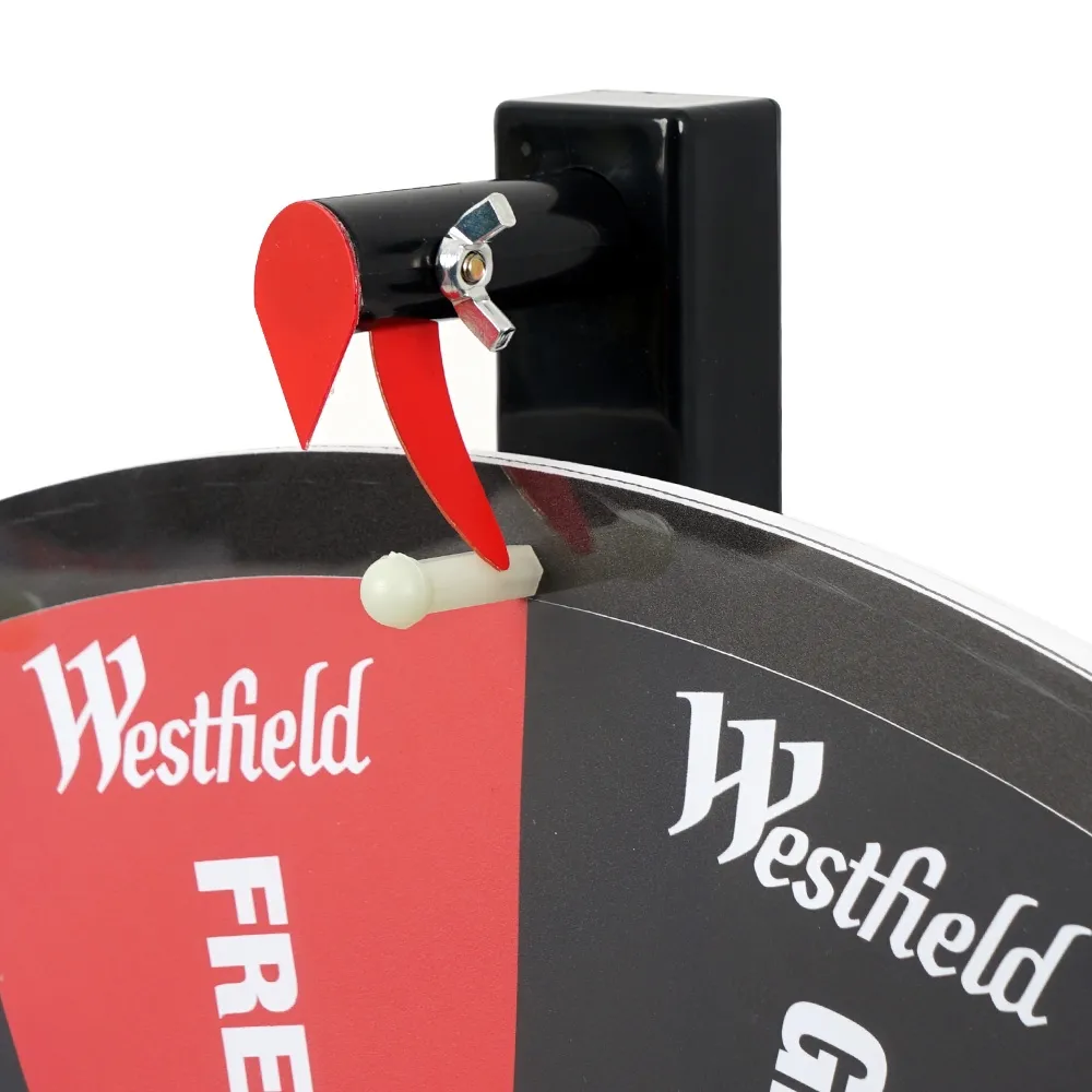 The raffle wheel, custom spinning prize wheel has pegs between each of the game slots that allow the red pointer to generate noise as the game is spun, helping create excitement. The tabletop spin and win game has a 600mm diameter wheel that allows for large printing that is easily seen by participants. The 695mm tall unit is designed for tabletop use and has most of the weight of the unit concentrated in the wide base for stability purposes. The “H” design base is 395 x 205mm in total size to fit onto surfaces whilst leaving plenty of space for displaying prizes or promotional materials.
