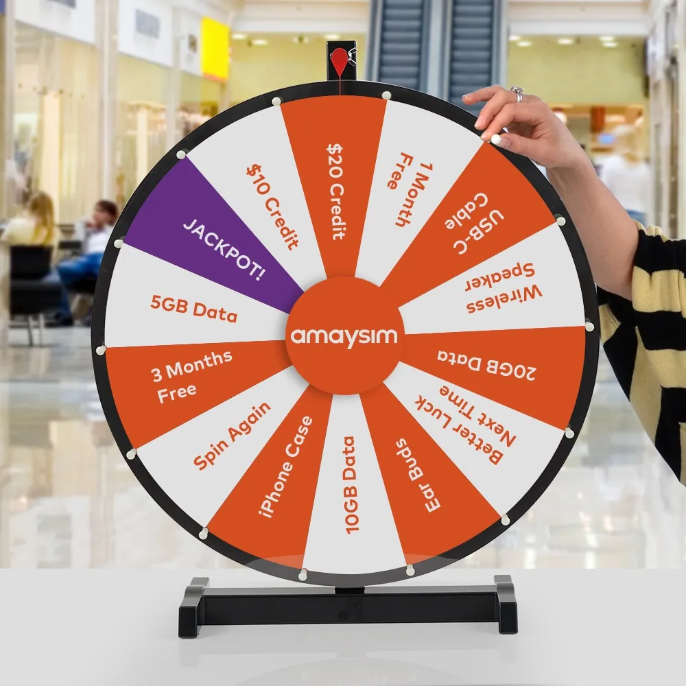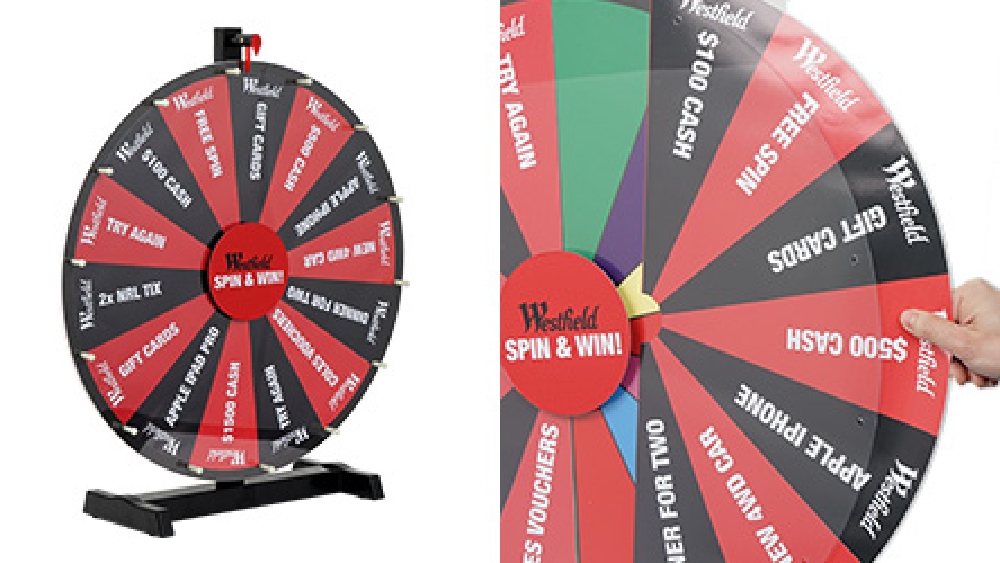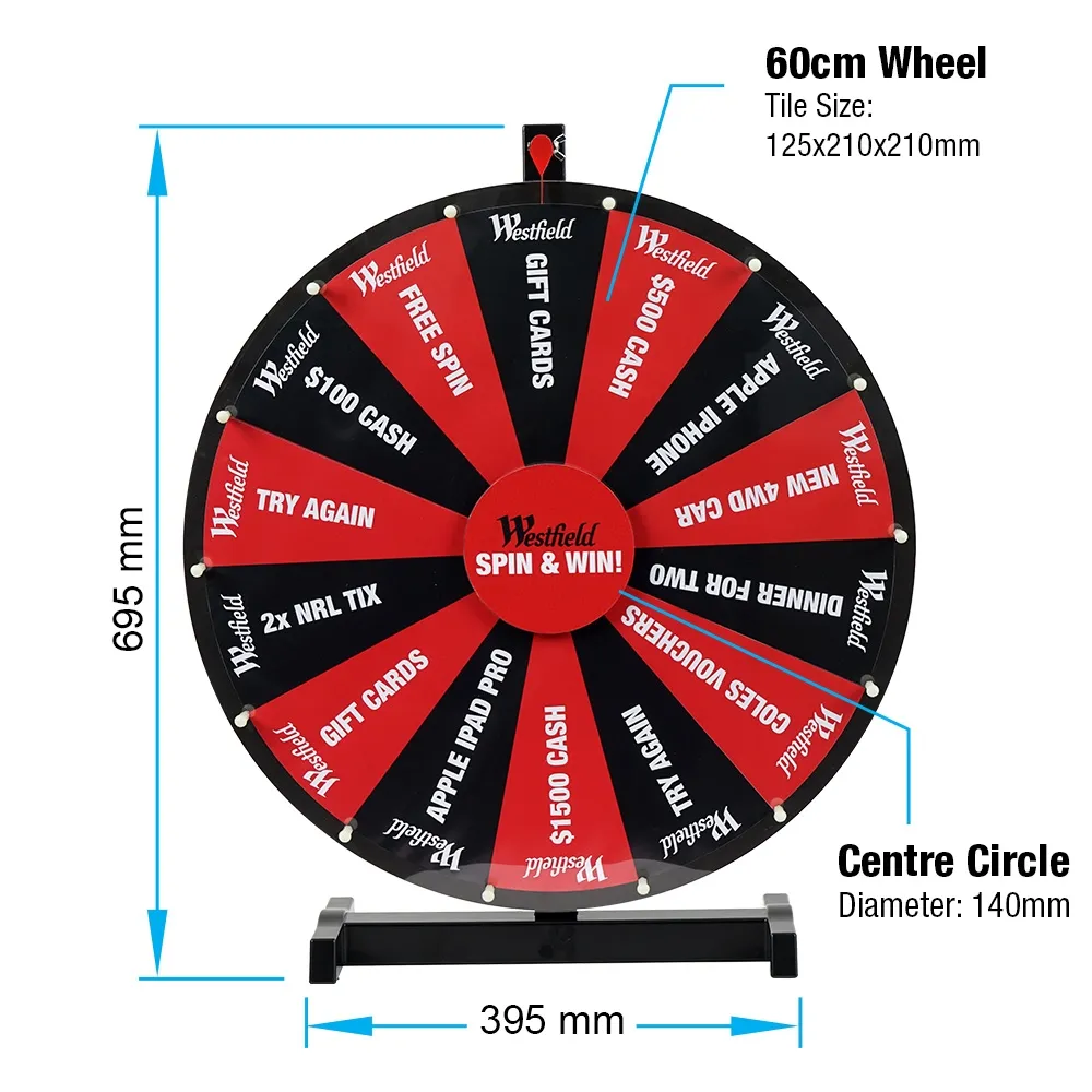 • Custom spinning prize wheel has 60cm diameter to easily see prizes