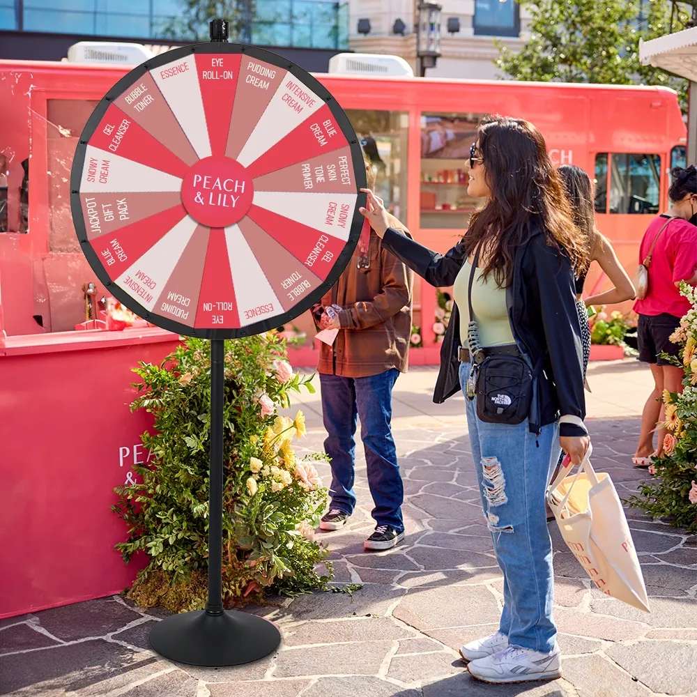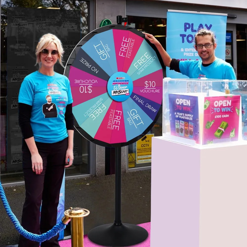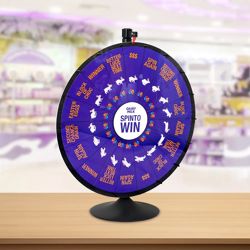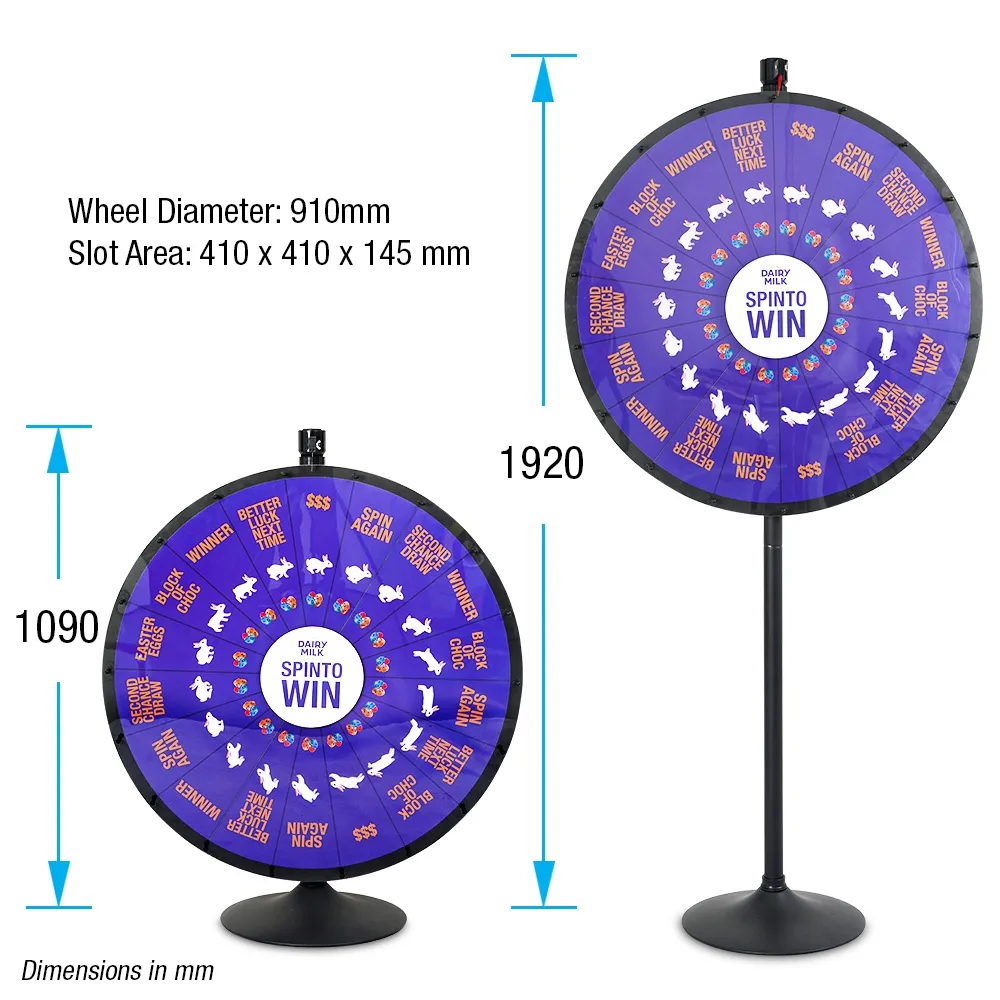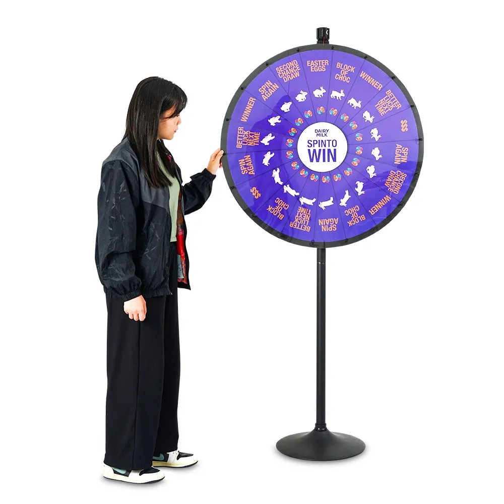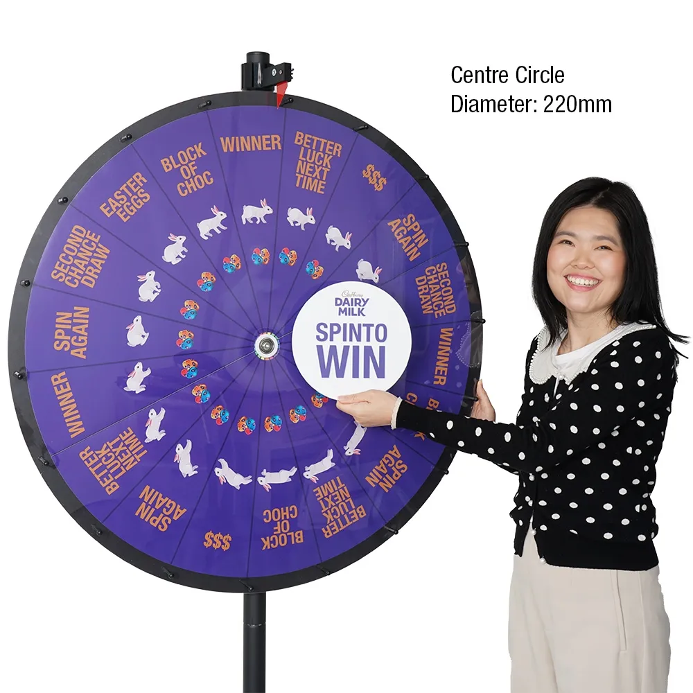 A prize wheel spinner, like other interactive game displays, features an adjustable stand that allows it to be used as a tabletop display or a free-standing floor unit. Adjustable from 109cm to 192cm in height, it’s perfect for universities, shopping centres, exhibitions, parties, carnivals, and team-building events to engage employees, potential customers, and students alike. The bright red pointer produces a clacking sound as it hits the pegs, adding to the excitement and grabbing the attention of passersby with both visual and auditory appeal.