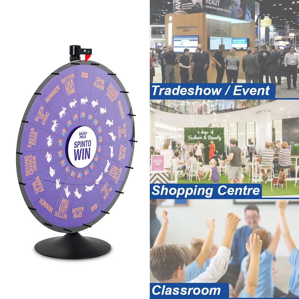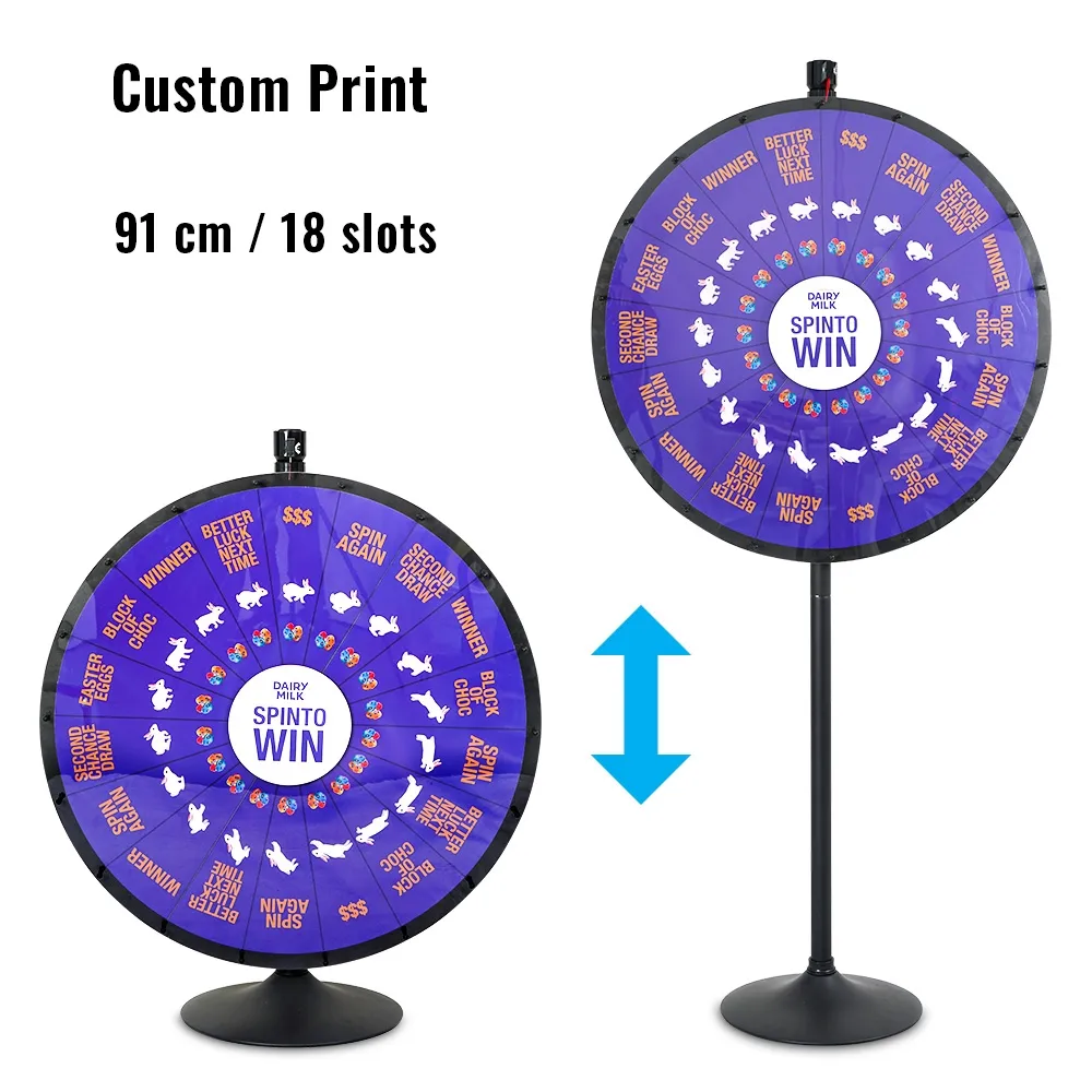 This prize wheel spinner features a large 91cm diameter wheel, providing an eye-catching display that draws people in with its size. The wheel includes 18 prize slots that feature your custom designs printed directly onto the board for a fully branded unit that easily garners attention. A digital printing process is utilised to offer vivid imagery & rich colours that display your logos, prizes, and more. The 22cm diameter centre disc has an additional graphic that is perfect for your company's logo, as it doesn't move as the wheel is spun. This unit is a fantastic way to attract attention and build excitement in various environments, from classrooms and corporate events to retail stores and trade shows.