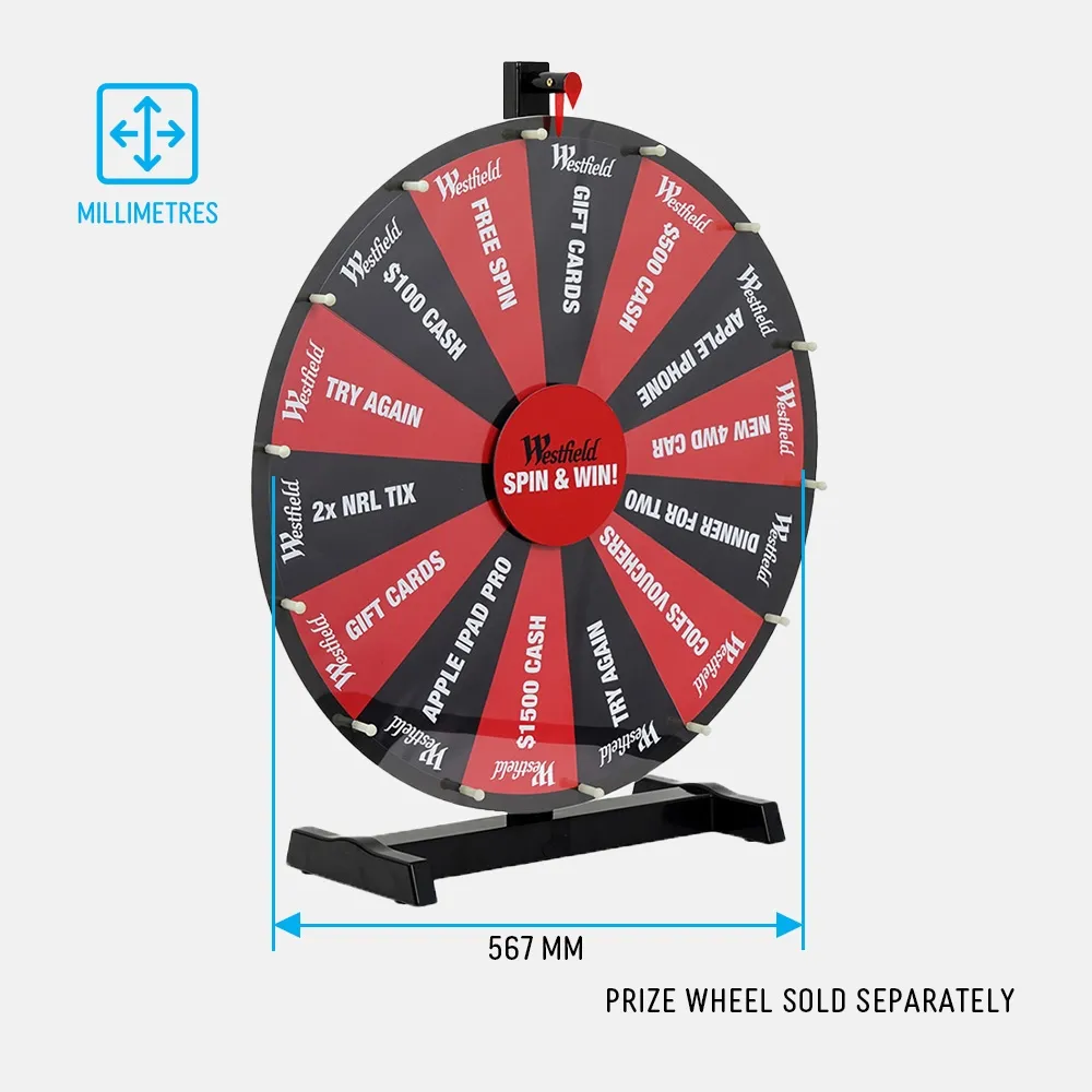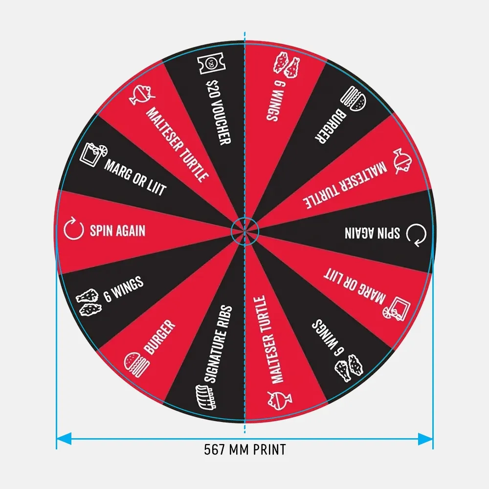 This 24" custom prize wheel print gives your spinning wheel a fresh edge for every campaign or event. Designed for Slimline 24-inch models, it replaces existing graphics with precision-fit prints that enhance visibility and engagement. Each segment can be personalised with logos, offers, or themed artwork to suit your promotion. Whether used at trade shows, retail activations, or corporate events, it ensures your display looks consistent, professional, and on brand.