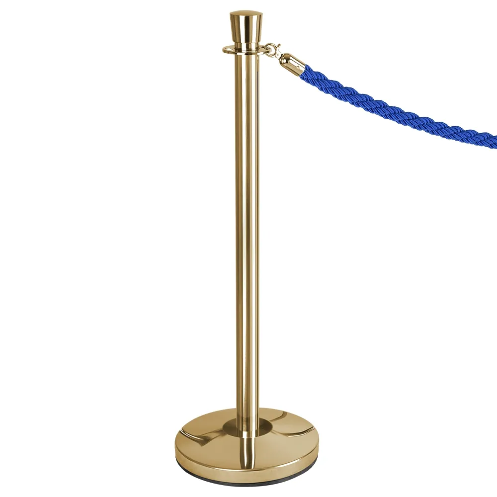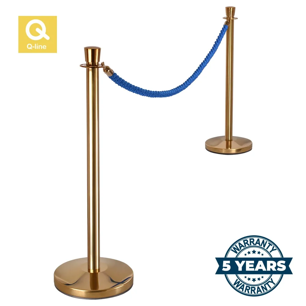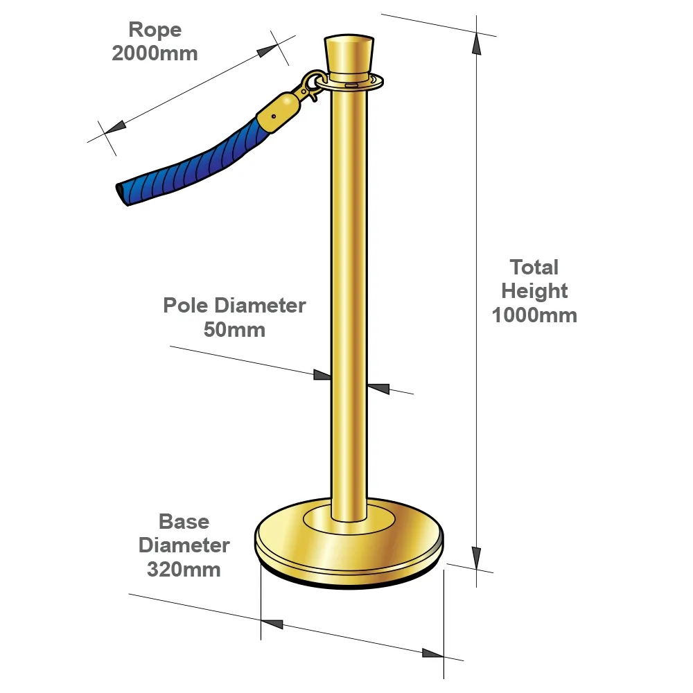 This rope stanchion set includes everything you need to start to set-up a queue or section off an areas. The crowd control stanchions are both 1m tall, made of steel with a gold finish. This provides a strong post for use in public areas that will fit in with any décor thanks to the professional look. The top of the post has a globe for added ornamental design. This coupled with the colour of the rope & finish of the post provides a striking look for use in any location.