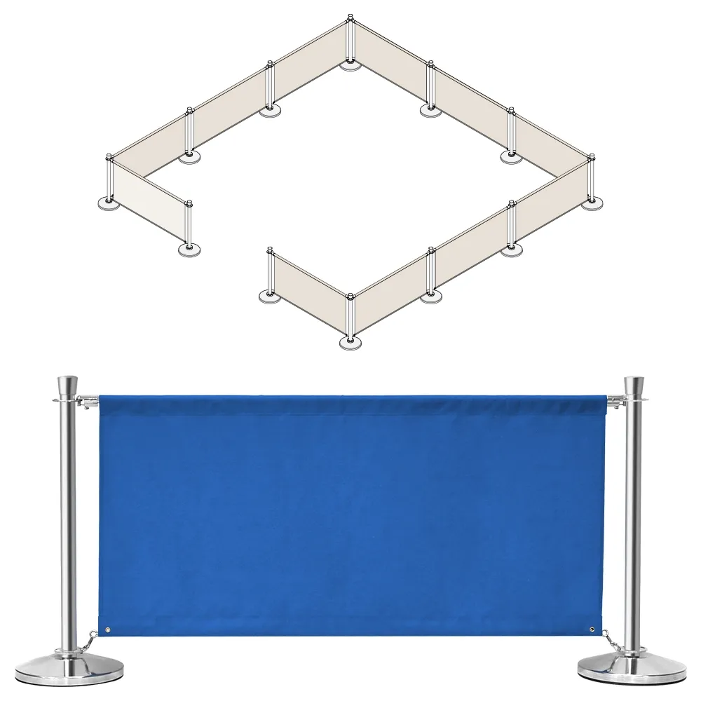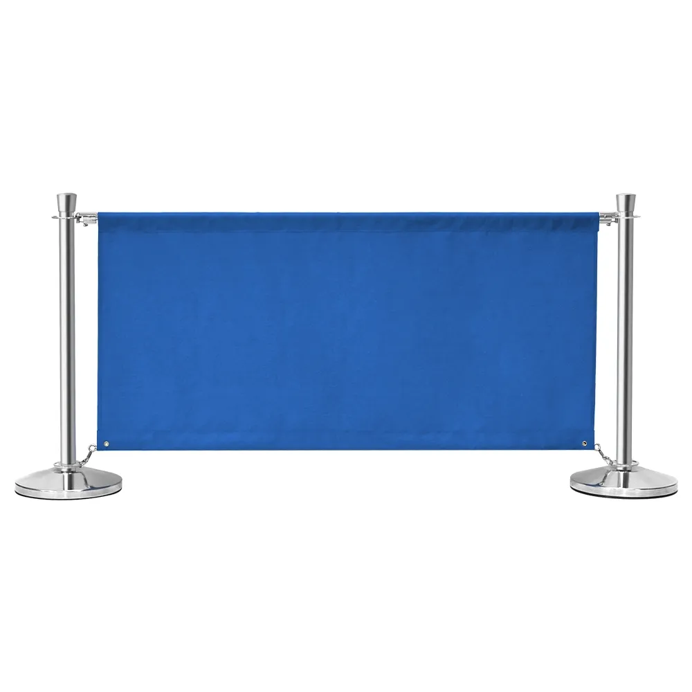 Cafe barrier screens make a great addition to not only restaurants and coffee shops but also exhibition halls, cinemas, shopping centres, retail stores, information centres, and more! This kit can be used to create an outdoor seating area, manage a queue, and cordon off restricted sections using the (11) included fabric banners. These banners are made from blue polyester, offering a hard-wearing unit that can be used at indoor or outdoor events without issue for years to come. The banners are hung between the barrier posts using stainless steel rods that are threaded through channels sewn into the top of each banner. There are also metal grommets on the bottom sides of the banner that attach to the stanchions using spring clips (2 included per banner), allowing movement with the breeze without blowing upwards. Quick clip ends on the rods securely attach to the posts with a thumb clip for quick removal by employees.