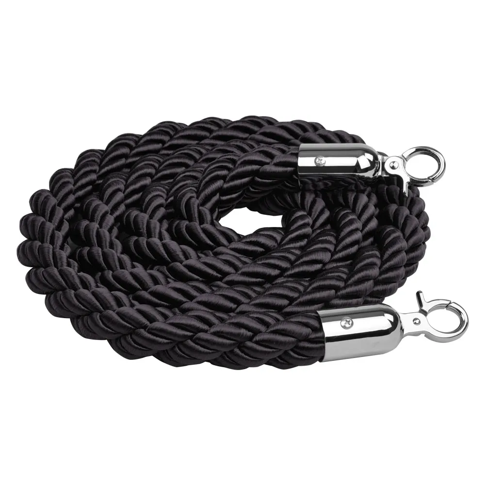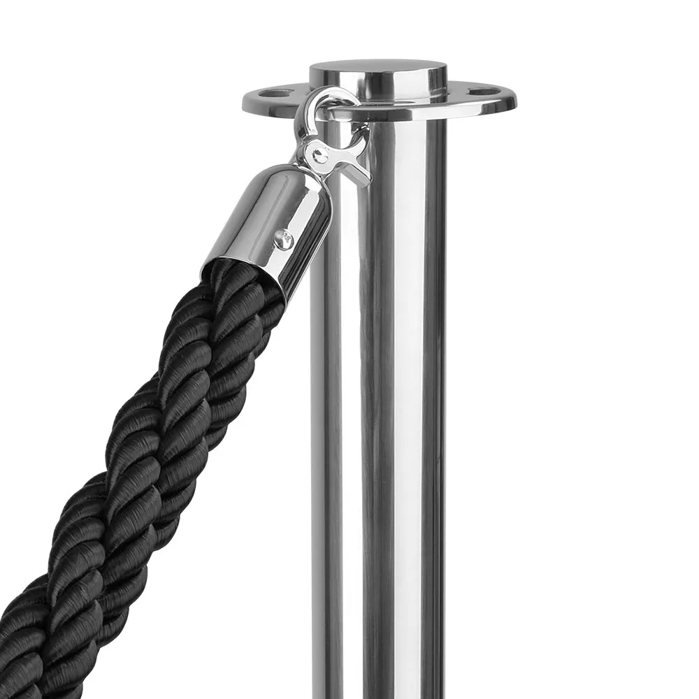 This stanchion set, like queue belts and crowd control ropes, have a 2m long black braided rope that connects to the posts using clasps that are on each ends. The clasps easily attach for quick set-up and can be undone to let visitors through to different areas. The top of the post has slots for (4) ropes to be attached to in different directions to better set-up a queue or section off an area.
