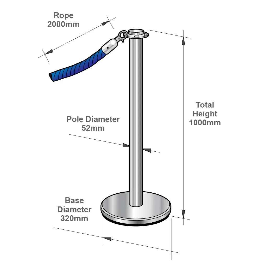 - Stanchion is 1m tall, made of steel for durability with silver finish for style