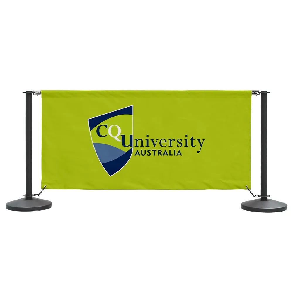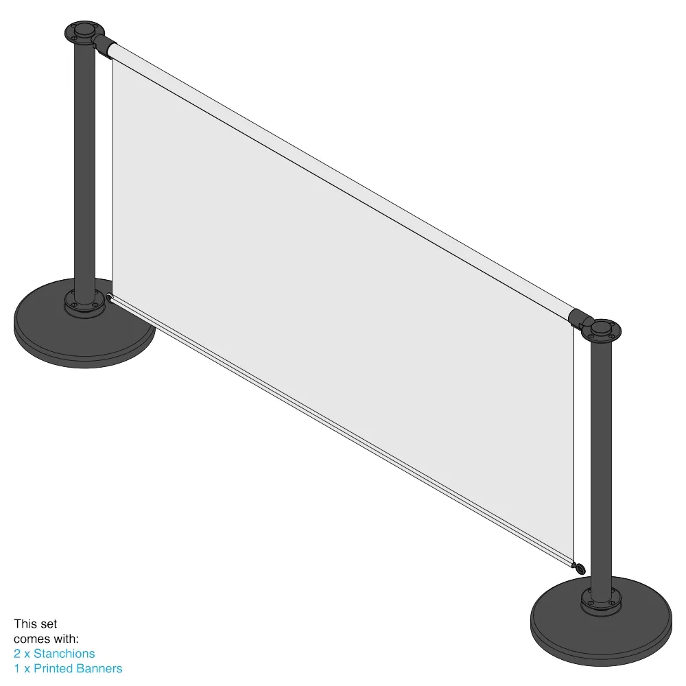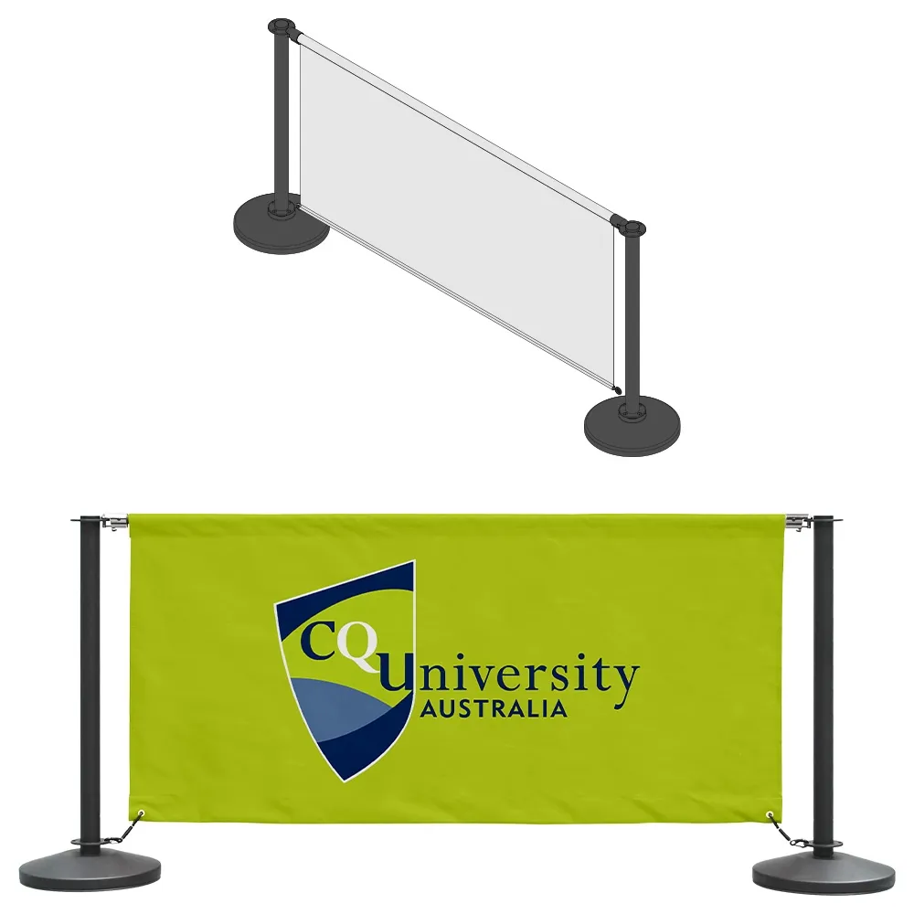 The custom cafe banner, like restaurant breeze barriers, uses stainless steel stanchions in matte black that work with any décor. There is a 4-way adapter both atop the post and above the base, allowing additional banners or even VIP ropes to be connected to help form a queue, cordon off areas, and create an outdoor seating area. The bottom of the base has a rubber ring that protects floors when used at indoor venues. Additional kits are available with more stanchions and banners as well as simple versions with blue, black, white, or red banners. Slimline Warehouse offers fast shipping to anywhere in Australia, buy online today!