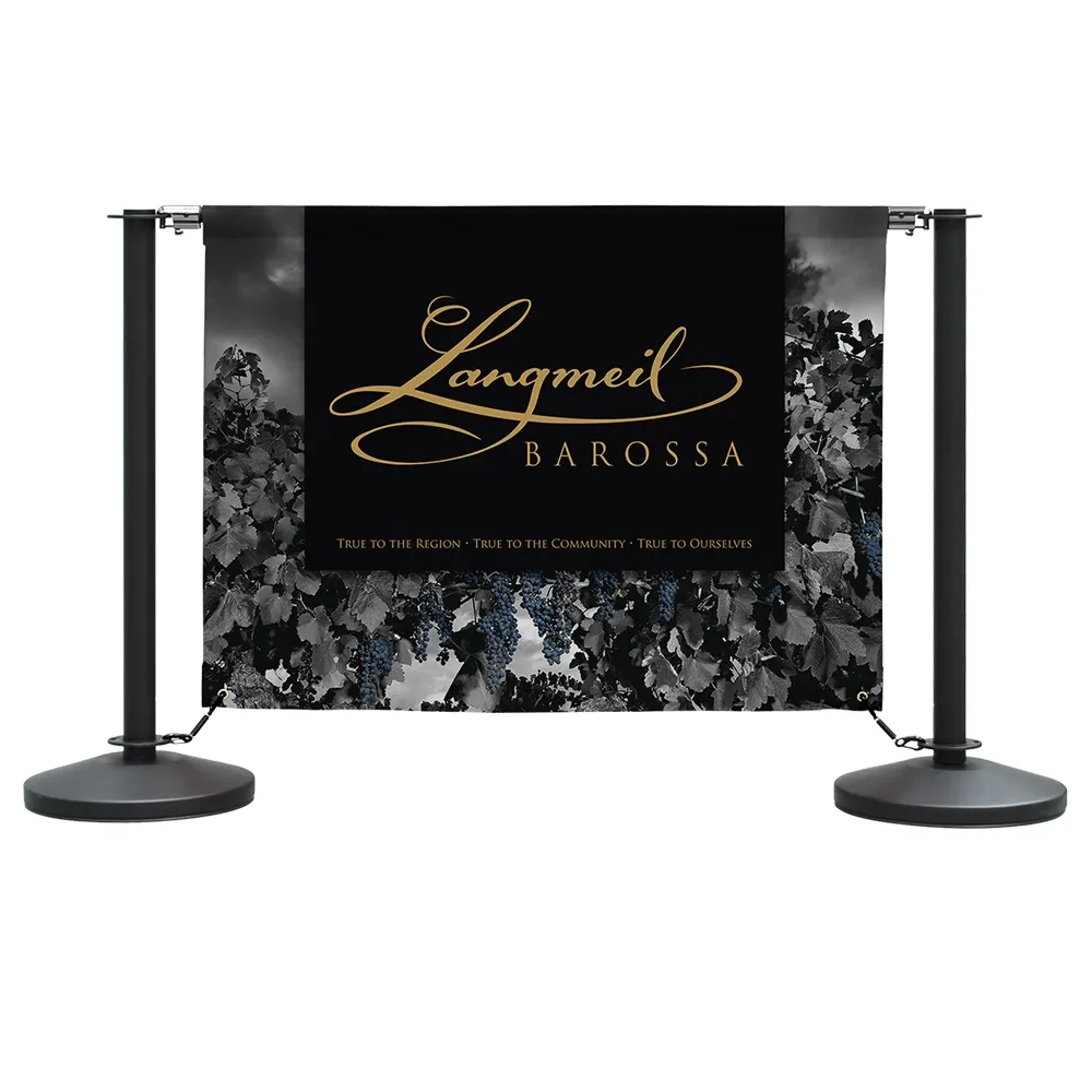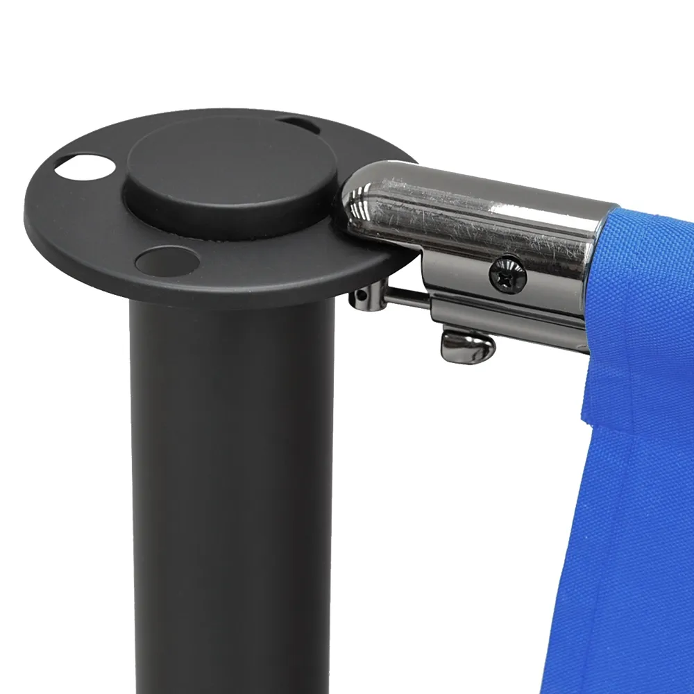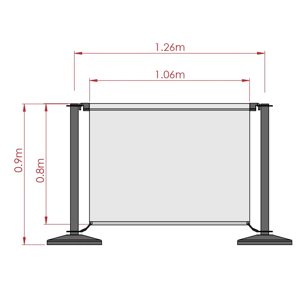 These cafe screens, like restaurant wind barriers, have stainless steel stanchions included that are each 1m tall. The barrier posts have a matte black finish and flat top for a sleek look that works well with any style of décor. There is a 4-way adapters atop each post that allow banners or VIP ropes to go out in multiple directions to best suit your needs. A second adapter on the bottom allows the included spring clips to attach the banners above the base to allow them to move slightly during breezes without going into passersby.