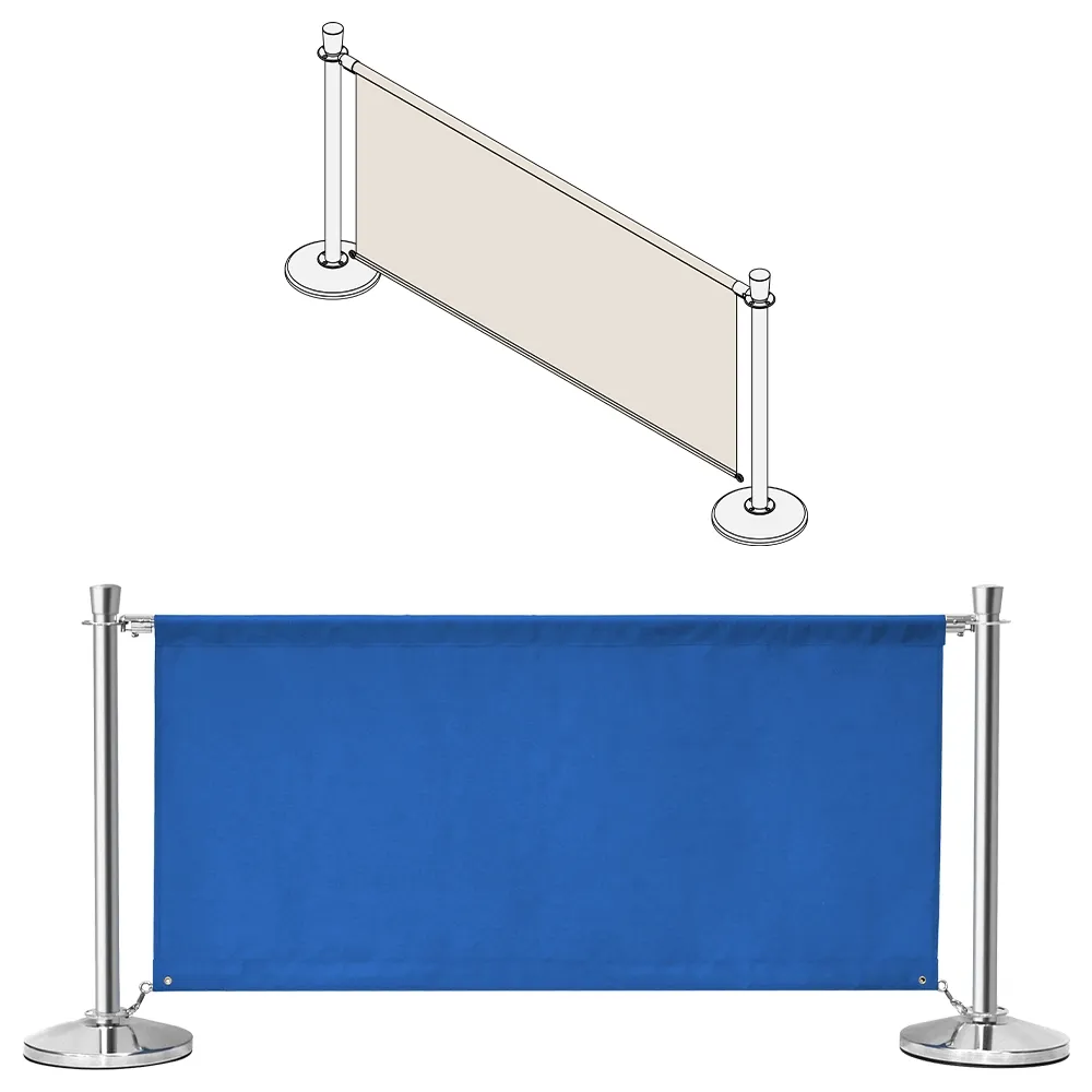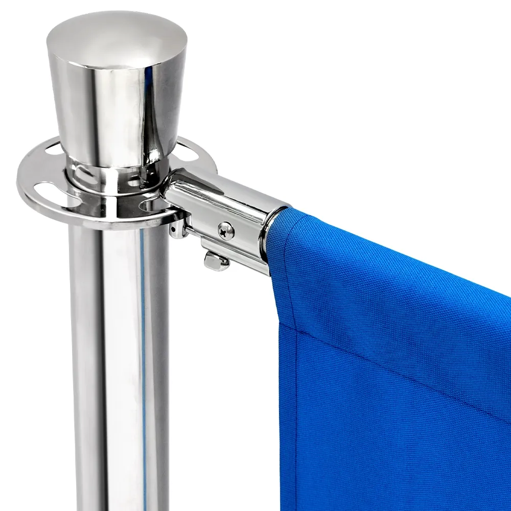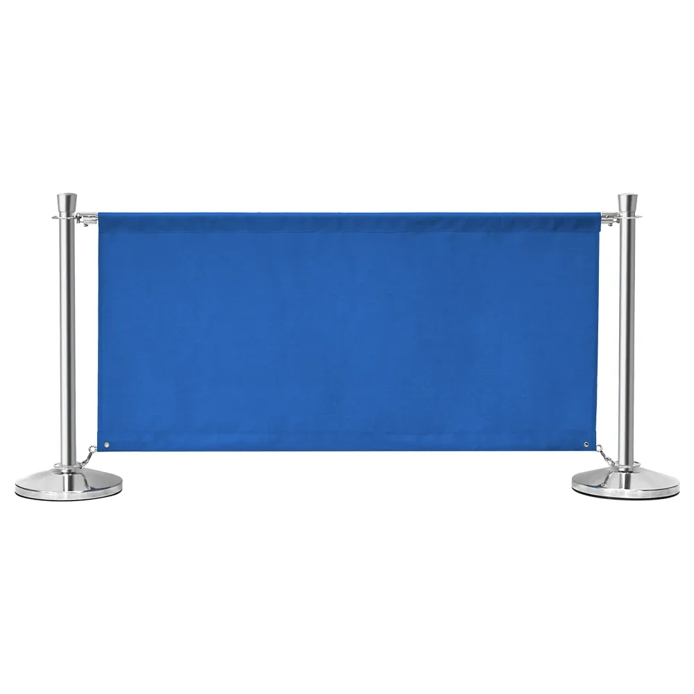 This market barrier features a blue banner made from polyester that is hard-wearing to work well in both indoor and outdoor areas! The 1.8m long banner is held up by a stainless steel rod that is threaded through the top to connect to the two stanchions. The bottom of the banner is connected to the posts using (2) spring clips that attach to grommets in the banner to allow it to be moved by wind without coming undone and bothering patrons! The stanchions are each .9m tall with a flat top and have a 4-way connector to allow not only this banner but additional banners or VIP ropes to be attached to help complete your needs for sectioning off areas, guiding patrons, or creating a queue!