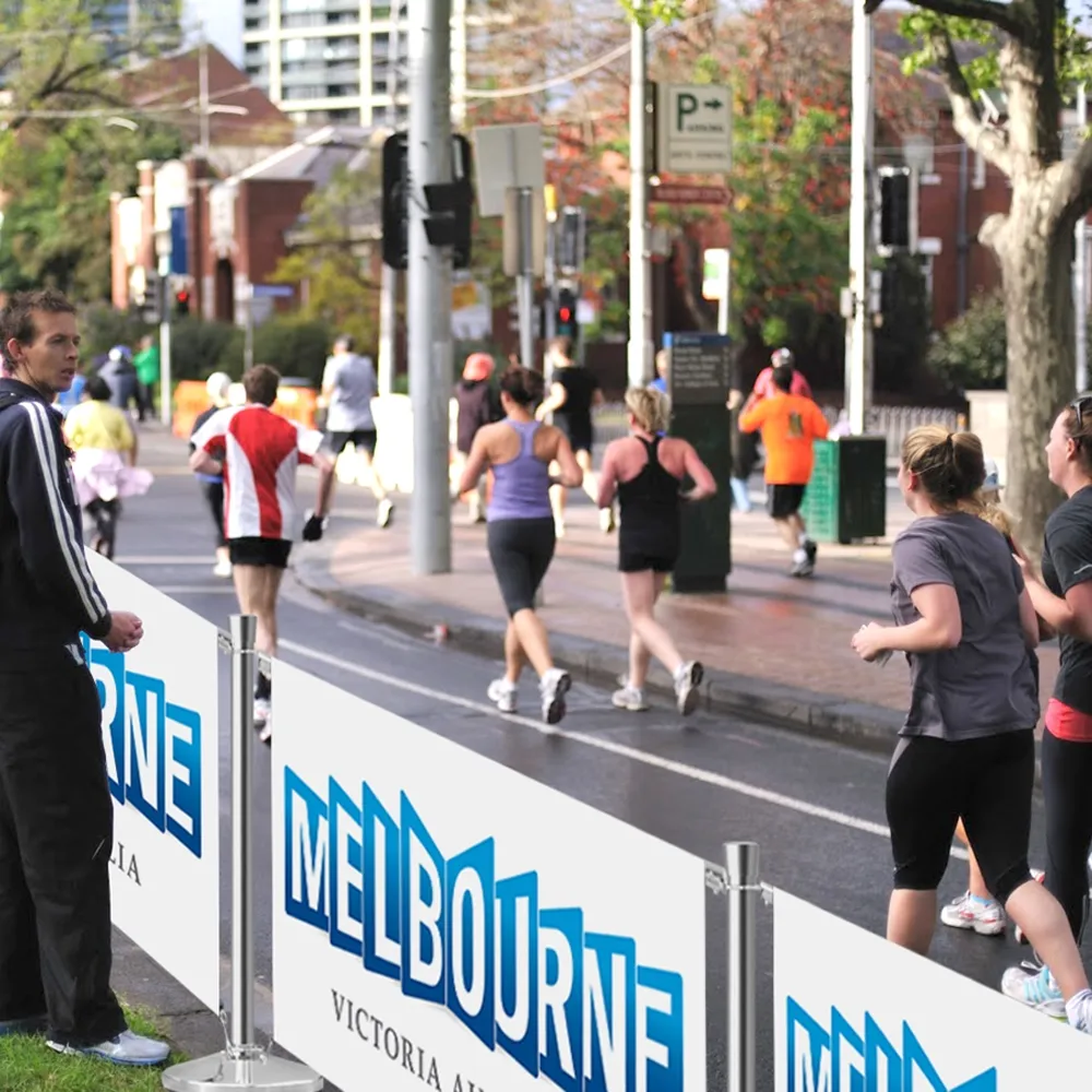These branded cafe barriers, like restaurant breeze banners, have (2) stainless steel stanchions in the kit that hold up the banners, with the polished chrome finish and tulip top head providing a professional appearance. To make attaching additional banners or VIP ropes easy, there are 4-way adapters atop the post and above the base. Check out our whole range of kits that have additional banners and posts as well as options with solid colour banners in blue, red, black, and white colour choices. The base of each stanchion has a rubber ring that helps to protect floors against damage when used indoors. Purchases are shipped fast to anywhere in Australia, buy online today for fast dispatch from Slimline Warehouse!