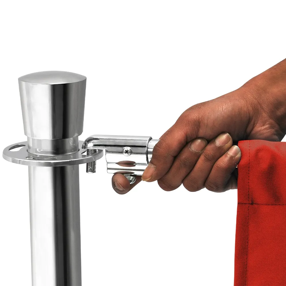 The display banner, also known as a wind barrier and cafe stand, uses steel bars to keep the banners in place. These bars attach to the stanchions using clips. The display banner has standard clips that hold the pole in place on the top, with quick release clips on a spring for the bottom pole. These quick release clips ensure the fabric remains taut while in use.