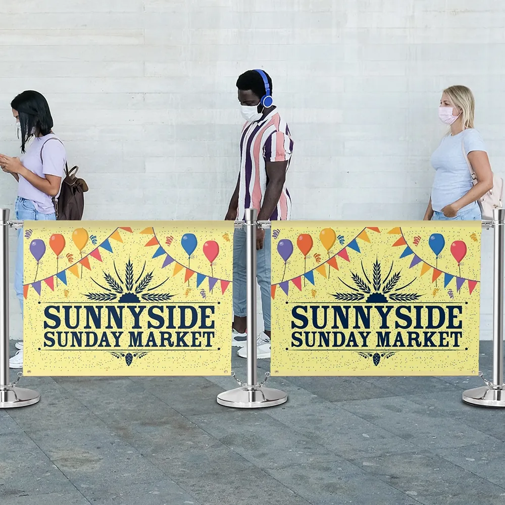 Custom cafe barriers provide a way to manage a queue, set up an outdoor seating area, cordon off restricted sections and more in a stylish manner! The breeze banners have custom designs printed on one-side of the fabric, perfect for placing logos and information to help draw passersby attention. A digital printing process using dye-sublimation is used to ensure true-to-design depictions of your graphics in rich colours and vivid imagery! Our in-house team is available to help with graphics if needed, with different tiers available to meet the exact needs of your business!