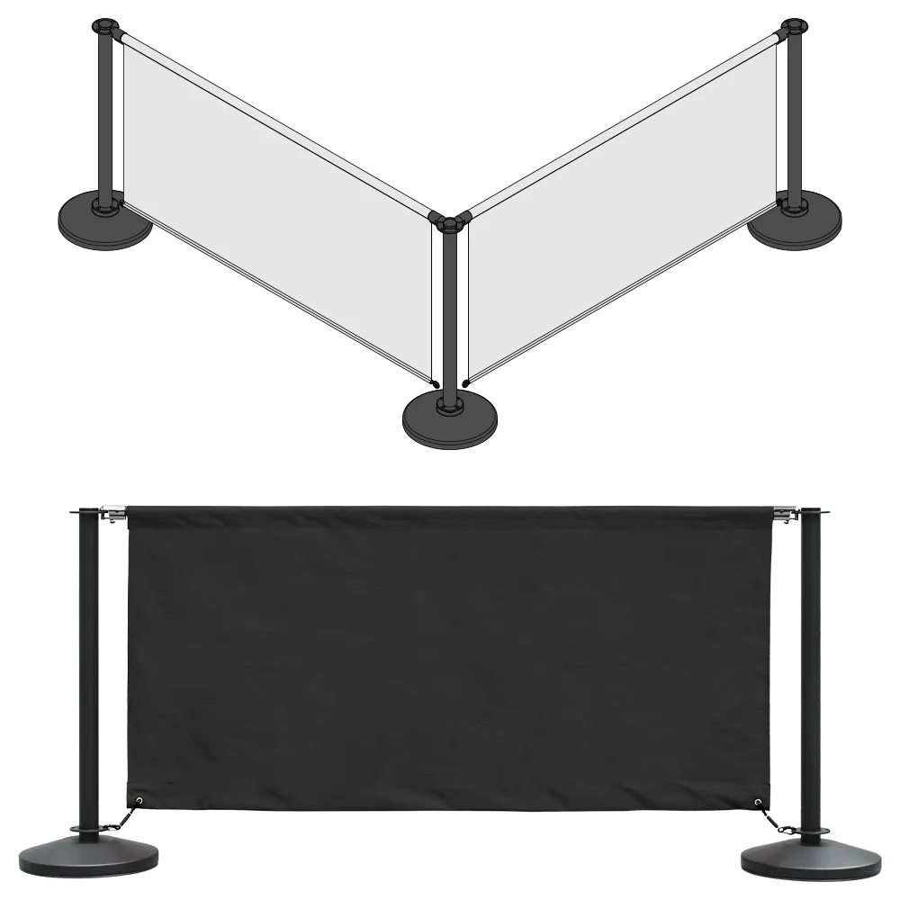 These display banners, cafe barriers include 3 stanchions and (2) banners. You can make different configurations of these to best suit your needs, and multiple displays can be attached together to create an alluring display. The cafe barriers are used in many businesses effectively to create an outdoor area with a wind barrier.