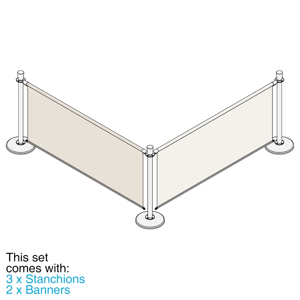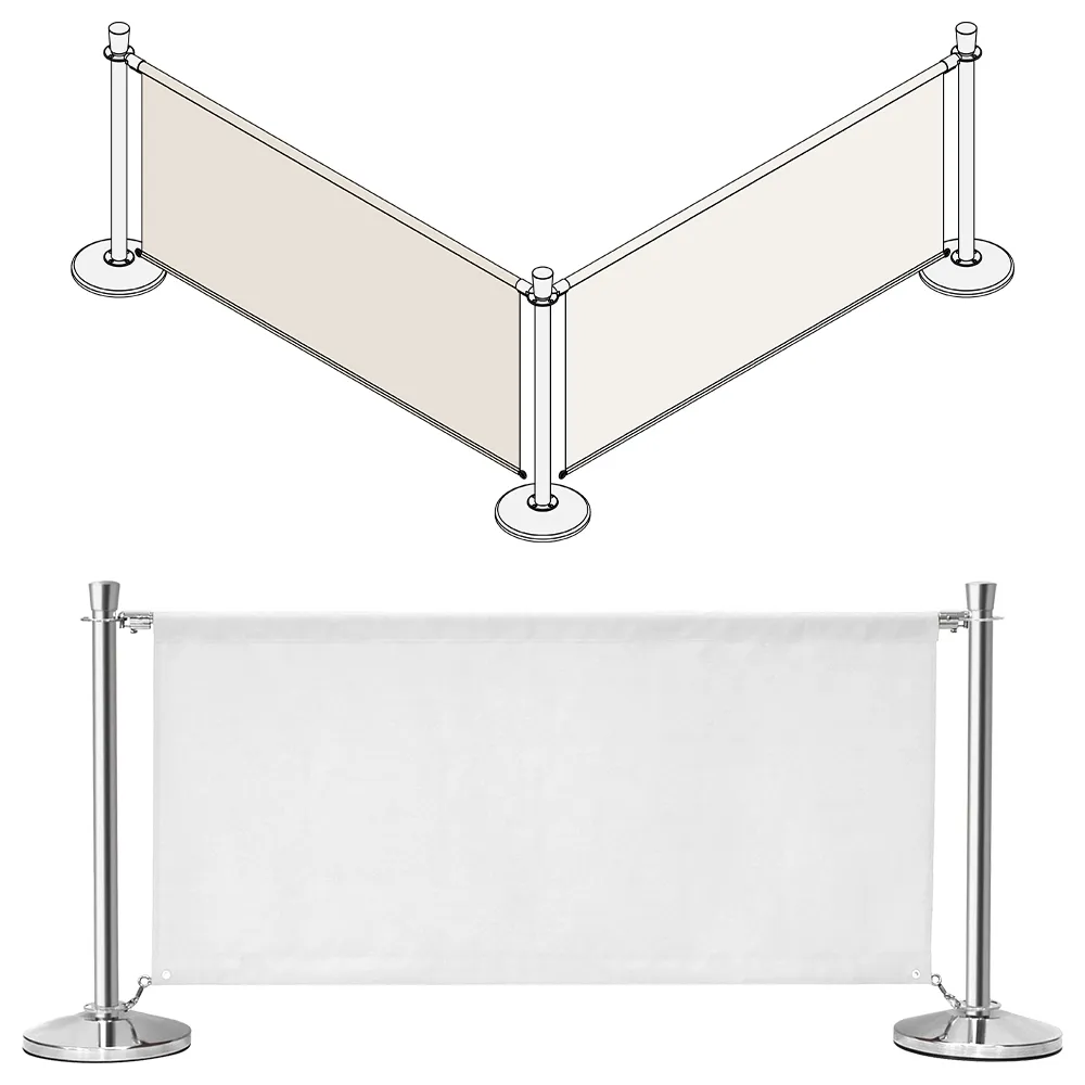Outdoor cafe dividers utilise fabric banners to help section off seating areas, cordon off places where visitors aren't allowed, and manage queues using stylish banners! There are (2) fabric banners included with this kit, each made from hard-wearing white polyester fabric to match any style and hold up well with daily use indoors or outdoors! There are channels sewn into the top of each banner that allows stainless steel rods to hold the fabric up between the barrier posts. These rods feature quick clips that securely attach to connectors on each post, with grommets in the bottom of the banners attaching to the base of the stanchions using spring clips that allow movement with the wind!