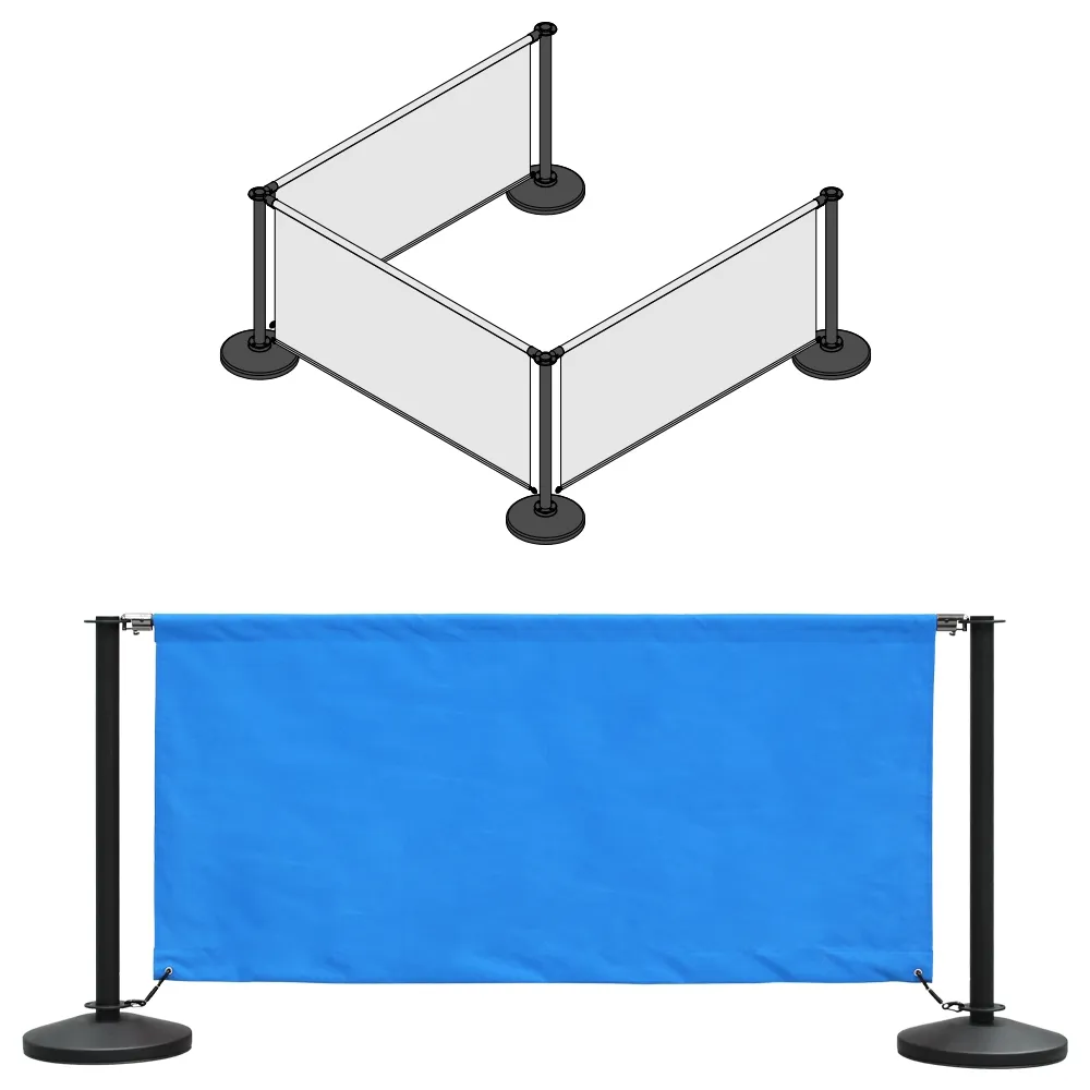 These outdoor cafe barriers, like pavement breeze banners, have steel barrier posts with a flat top head included that feature a matte black finish to work with any décor. The (4) stanchions have 4-way adapters atop the post and below the base make configuring the kit as needed simple, able to go out in multiple directions at once using the included banners or even VIP ropes. There are other kits available in a variety of colours and configurations, including custom print options with your designs digitally printed directly onto the fabric. The weighted bases of each post have a rubber ring that protects floors against damage. Orders made by 3pm AEST ship same day to anywhere in Australia with this and most other in stock products, buy online for your business today!