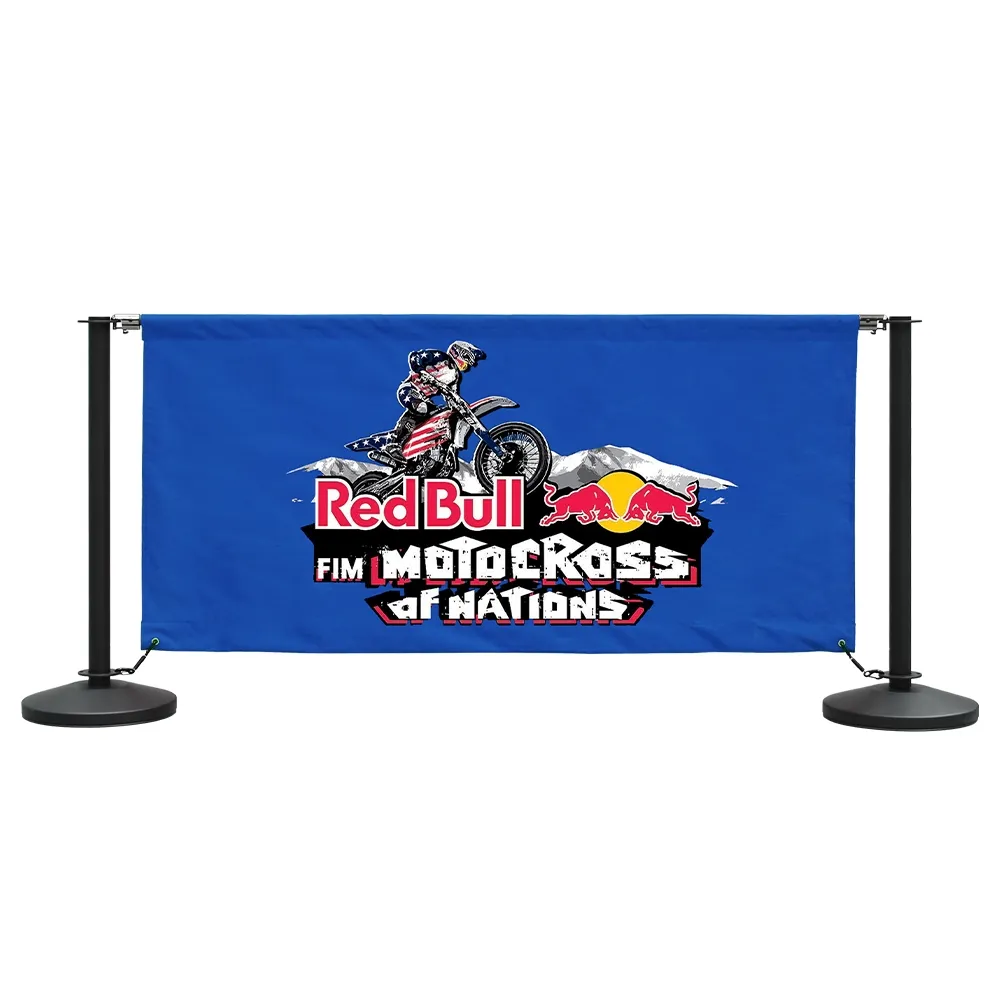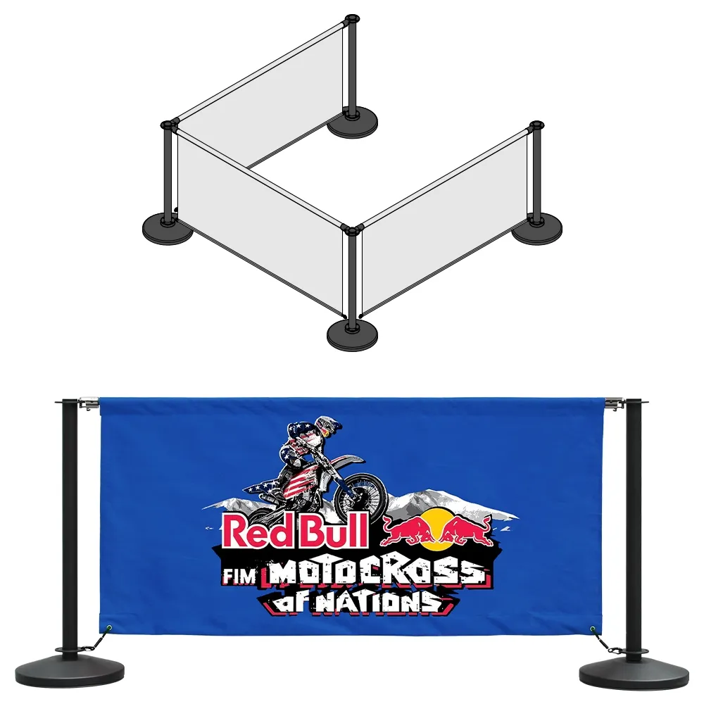 This display provides spring-loaded clips that attach the bars to the posts. The hard-wearing polyester fabric, combined with the stainless steel posts ensures a durable unit for any area! With full colour designs printed on on nylon-weave banners, your business is sure to garner attention from passersby.