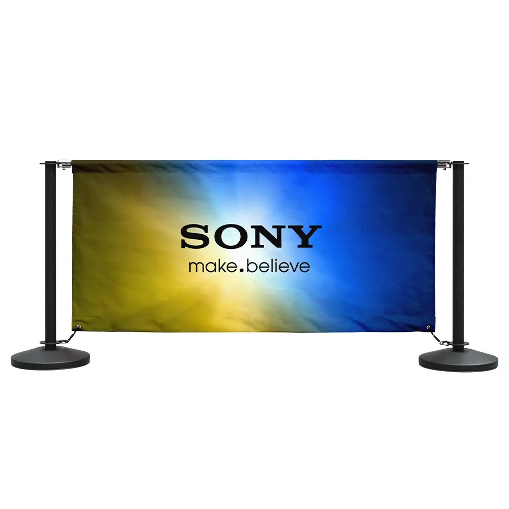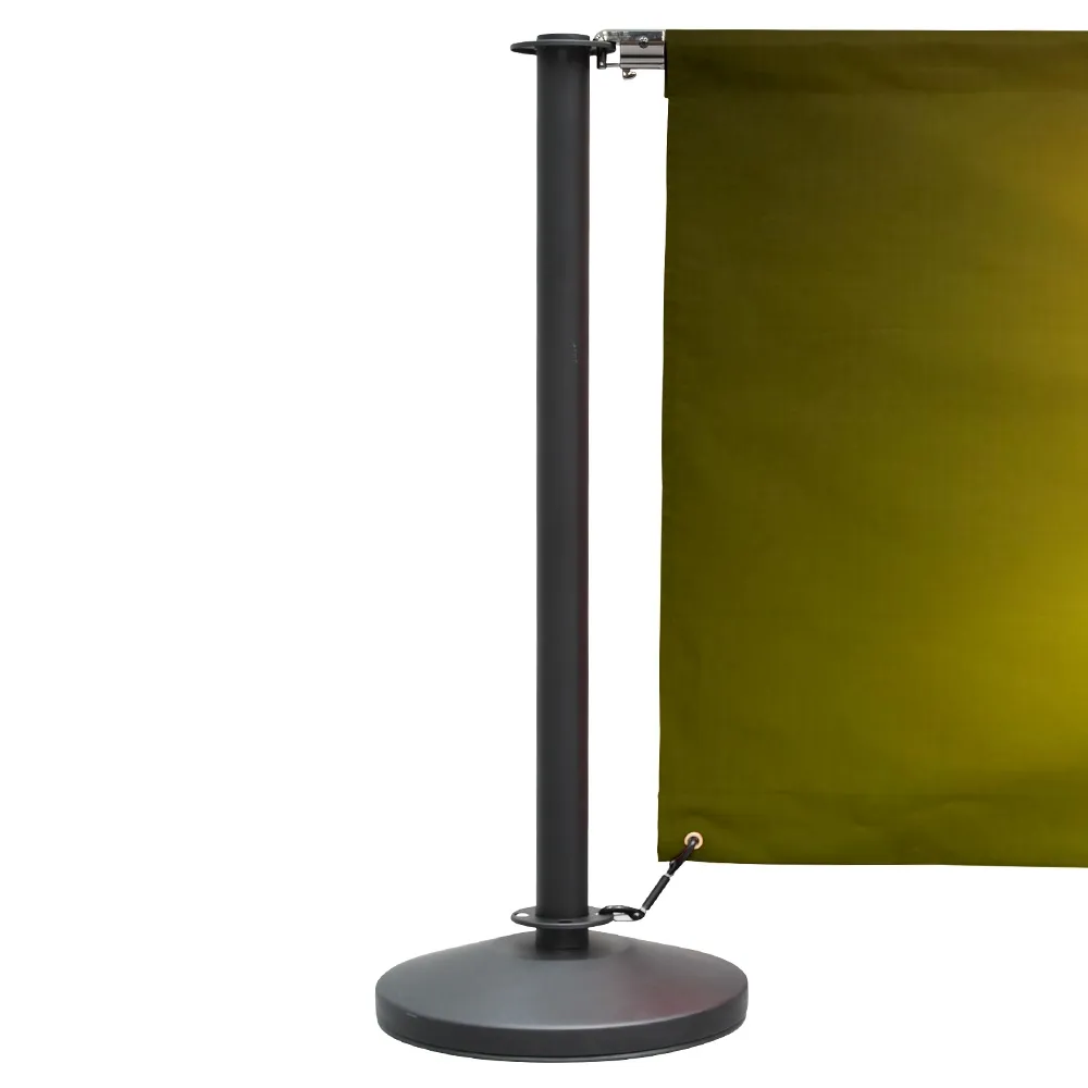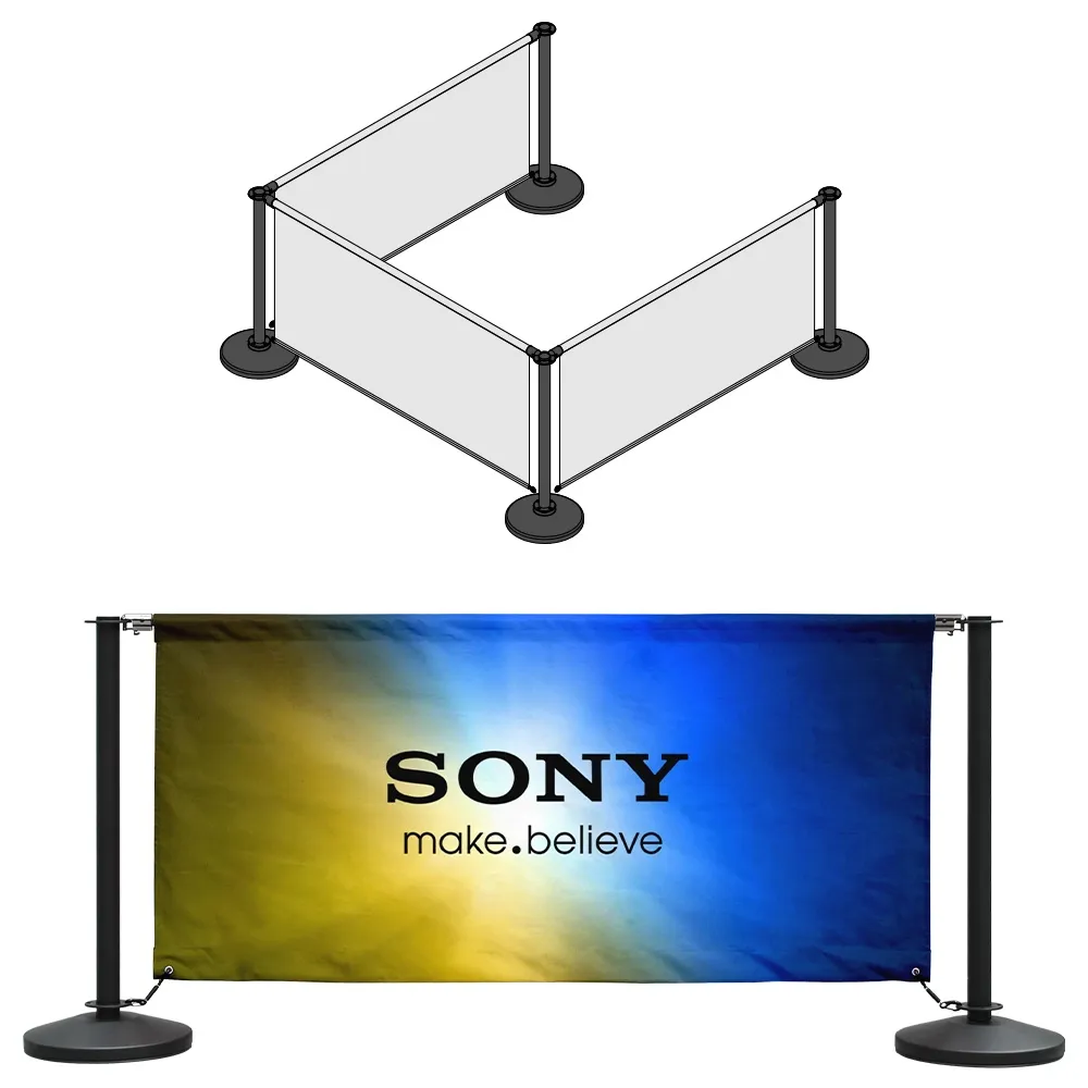 This cafe barrier has your custom design digitally printed in full colour on each side of the banner! Your logos are printed using a dye-sublimation process that ensure true to design depictions in vivid full colour that is sure to capture the attention of passersby to make your brand visible. The (3) banners are 1.6m long and made from hard-wearing polyester, providing a durable material that holds up well to daily use in both indoor and outdoor environments. There is a channel sewn into the top part of each banner that is designed for the included stainless steel rods to be threaded through, hanging the fabric down between two stanchions. Metal grommets in the bottom of each banner attach near the base to allow movement with breezes whilst keeping the fabric in place.