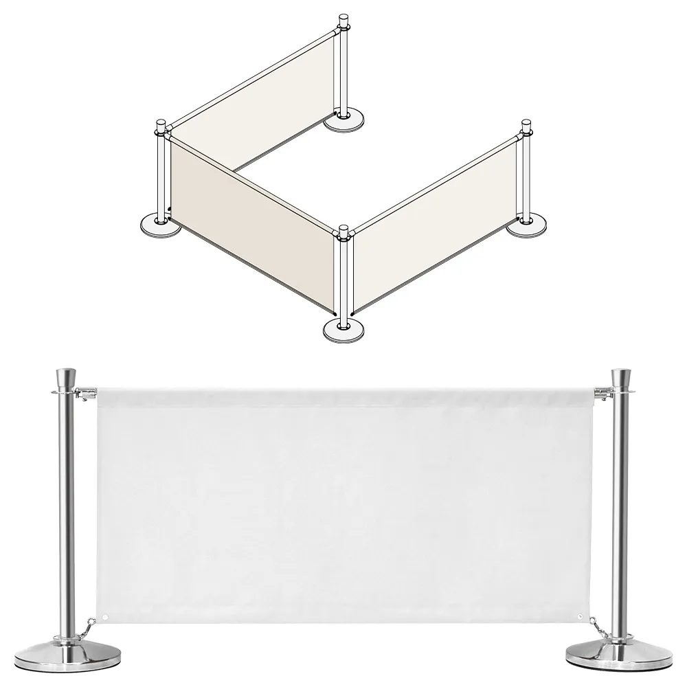 This restaurant outdoor barrier has (4) stanchions included that are made from stainless steel with a polished chrome finish for a stunning look that will work well with the style of any décor. The posts are each .9m tall with decorative tulip tops, and feature 4-way adapters both atop and above the base to make it easy to put the banners in the direction that suit your needs. This style of kit is popularly used to create separate seating areas from pathways, cordon off restricted sections, and manage queues in a number of business types. The bottom of the stanchions have rubber rings that prevent damage to floors when used at indoor businesses. There are different colours and configurations to choose from with these kits, including custom banners with our own designs digitally printed in full colour directly onto the fabric!