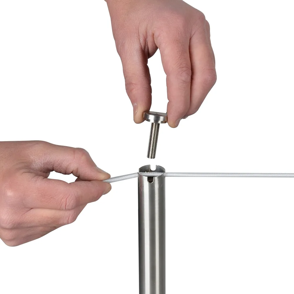 This cordon off barrier, like a gallery barrier, features slim posts that are only 25mm in diameter for a more upscale look when compared to standard retractable belts and barrier posts that work with VIP ropes. There are (6) total posts included with this set, each having (4) cut-outs in the top that direct elastic cord into direction with ease. The screw top on secures the cord in place to keep it taut, and it is recommended that the posts can be placed 1.5m to 1.8m apart for best use.