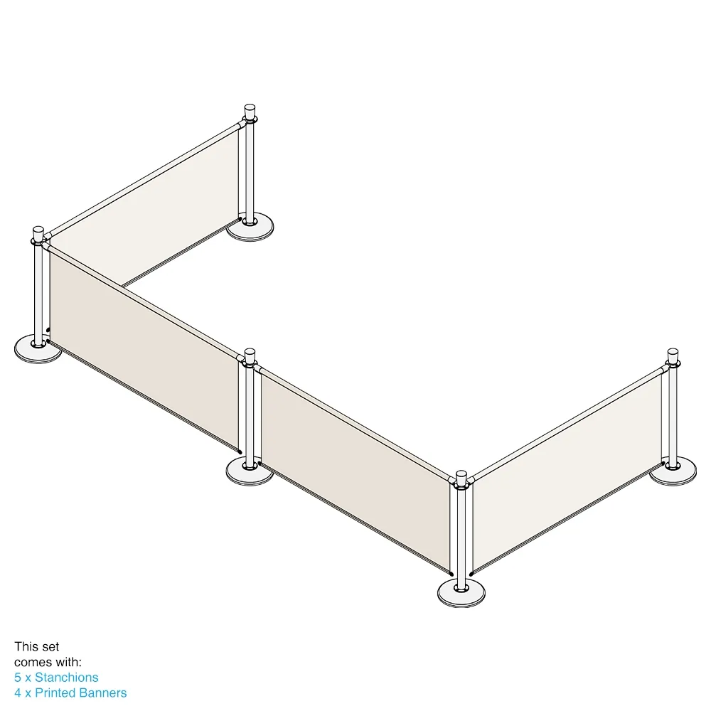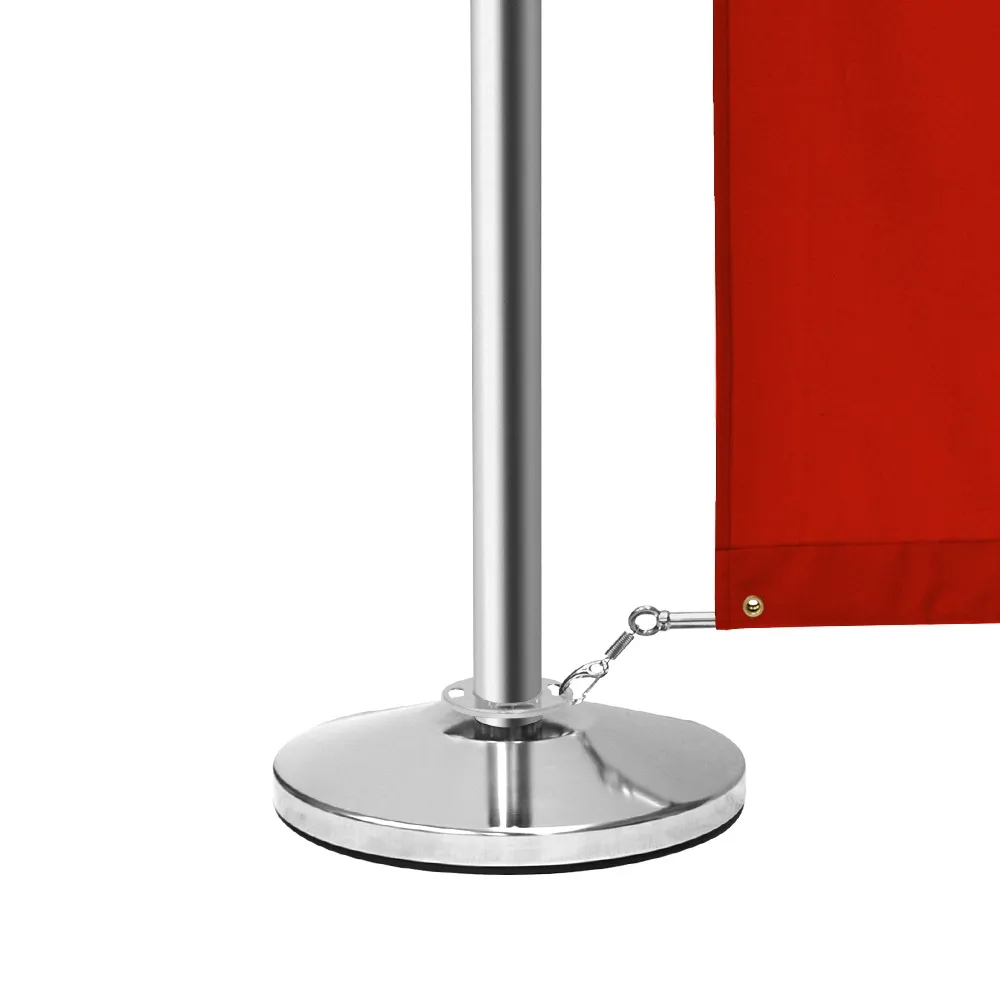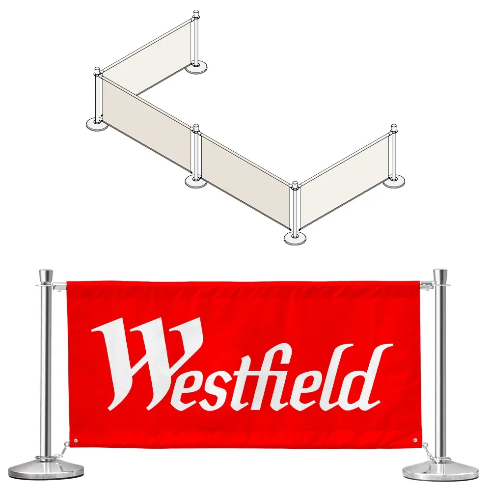 These custom cafe banners, like our line of restaurant breeze barriers, feature stainless steel stanchions with a polished chrome finish that are sure to turn heads. There are (5) posts included that are standard .9m tall and have a tulip top head, with 4-way adapters atop the post and above the base to make configuring banners as desired easy. Many other configurations with additional posts and banners are also available, including options with solid colour banners in blue, black, red, or white. Floor damage is prevented when used indoors thanks to a rubber ring on the bottom of the base. Order from Slimline Warehouse today for quick shipping to anywhere in Australia!