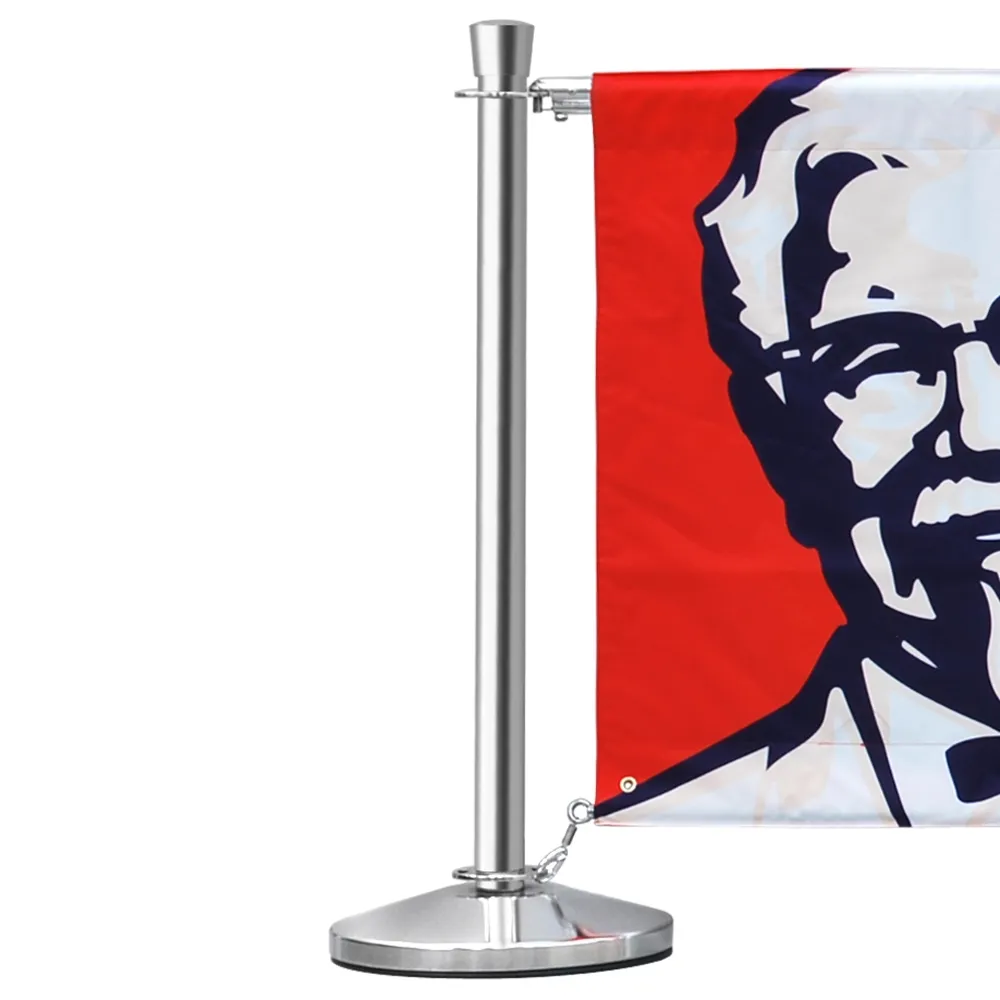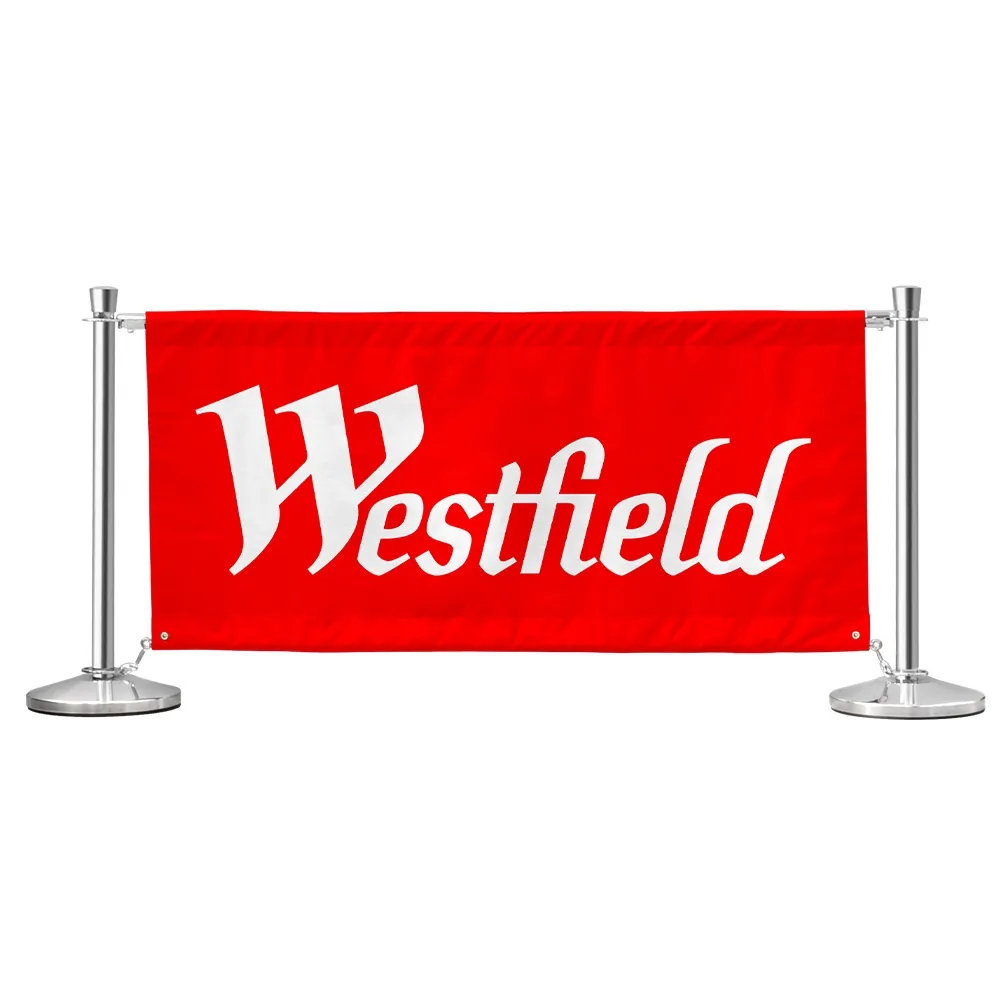 Custom cafe banners have your designs digitally printed in full colours on each of the 1.6m long banners! A dye-sublimation process is used to create vivid imagery in rich colours on both sides of the fabric that really draw the attention of passersby. Our in-house design team is available for graphic help, with different tiers available depending on your exact business needs. The (4) banners are all made from polyester to be hard-wearing for indoor or outdoor use. A channel sewn into the top allows the banner to hang between stanchions off of the included stainless steel rods that attach via secure quick clips. Metal grommets in the bottom of each banner attach near the base using spring clips to allow movement with breezes.