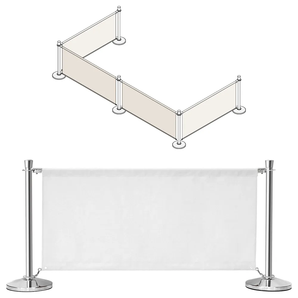 This cafe wind barrier is a great way to manage queues, cordon off restricted areas, and of course create a seating area for patrons! There are (4) 1.6m long fabric banners included that are made from hard-wearing white polyester for use indoors or outdoors without worry. The channel sewn into the top makes it easy to thread banners onto the stainless steel rods for it to hang down. These rods have quick clip ends that securely attach to the stanchion posts and have thumb triggers for simple removal. The bottoms of each banner feature metal grommets that attach above the post base using spring clips (2 included per banner) to allow movement with breeze without blowing over.