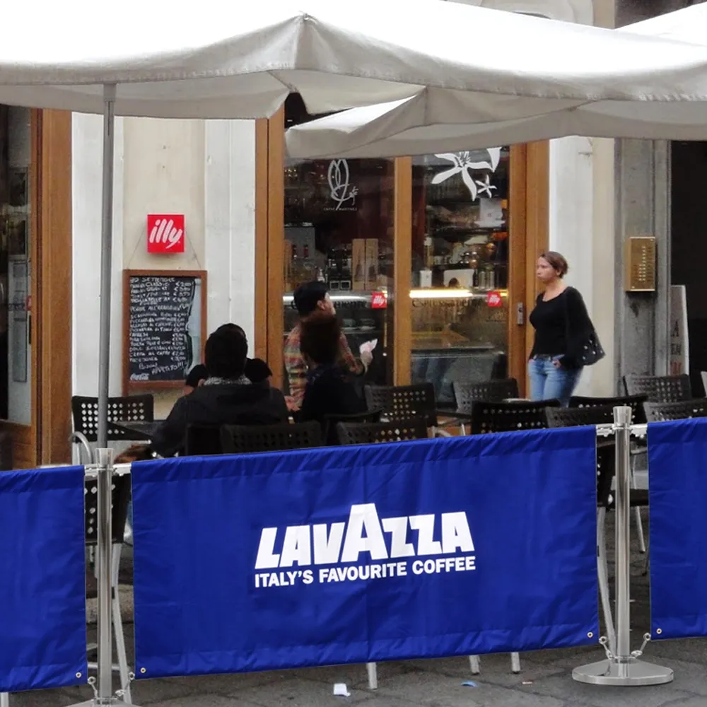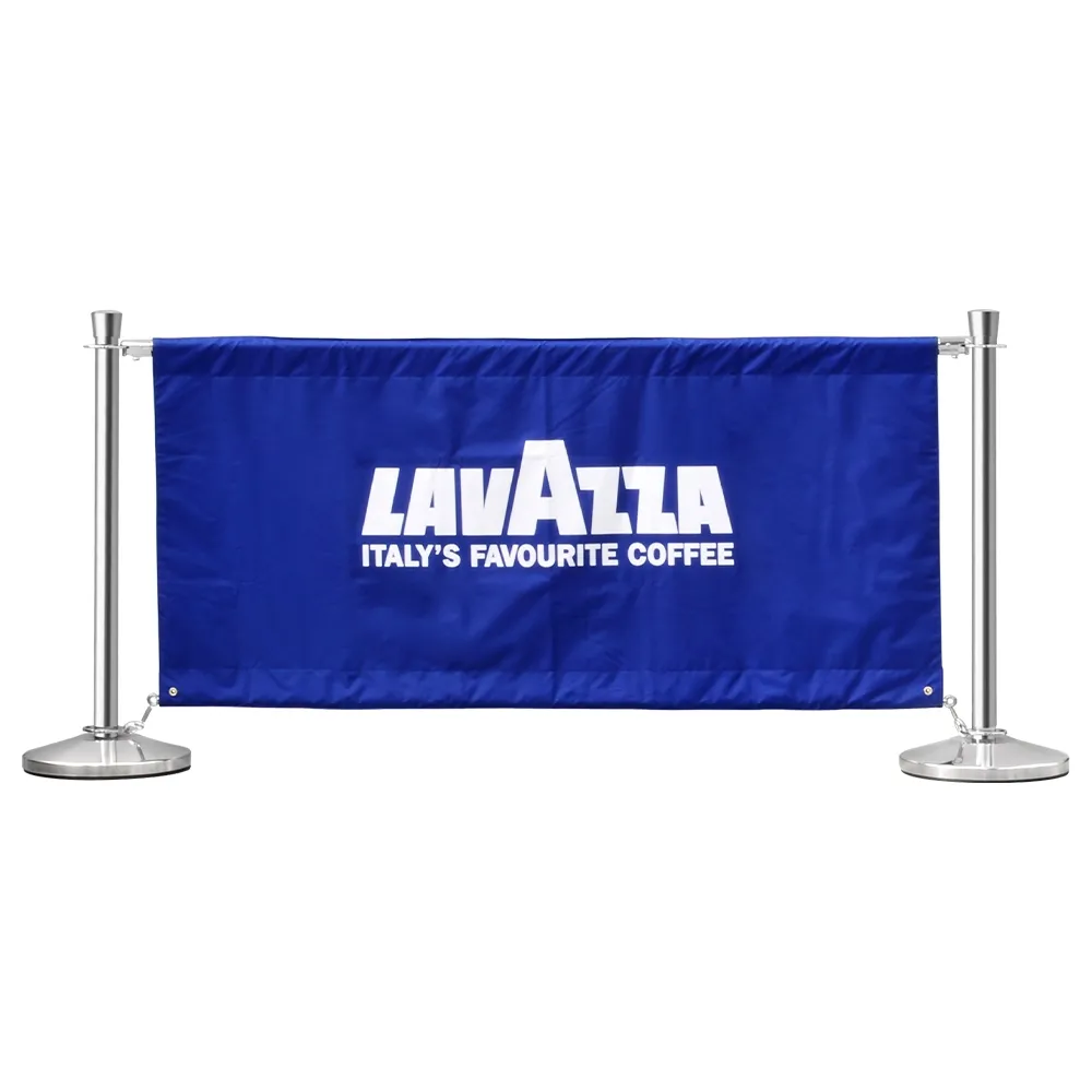 The restaurant barriers, also known as market banners and cafe banner system, has digital printing to show your custom graphics in vivid full colour. The cafe display uses a dye-sublimation process on the nylon-weave banners that give high quality representations of your graphics onto one side of the fabric.