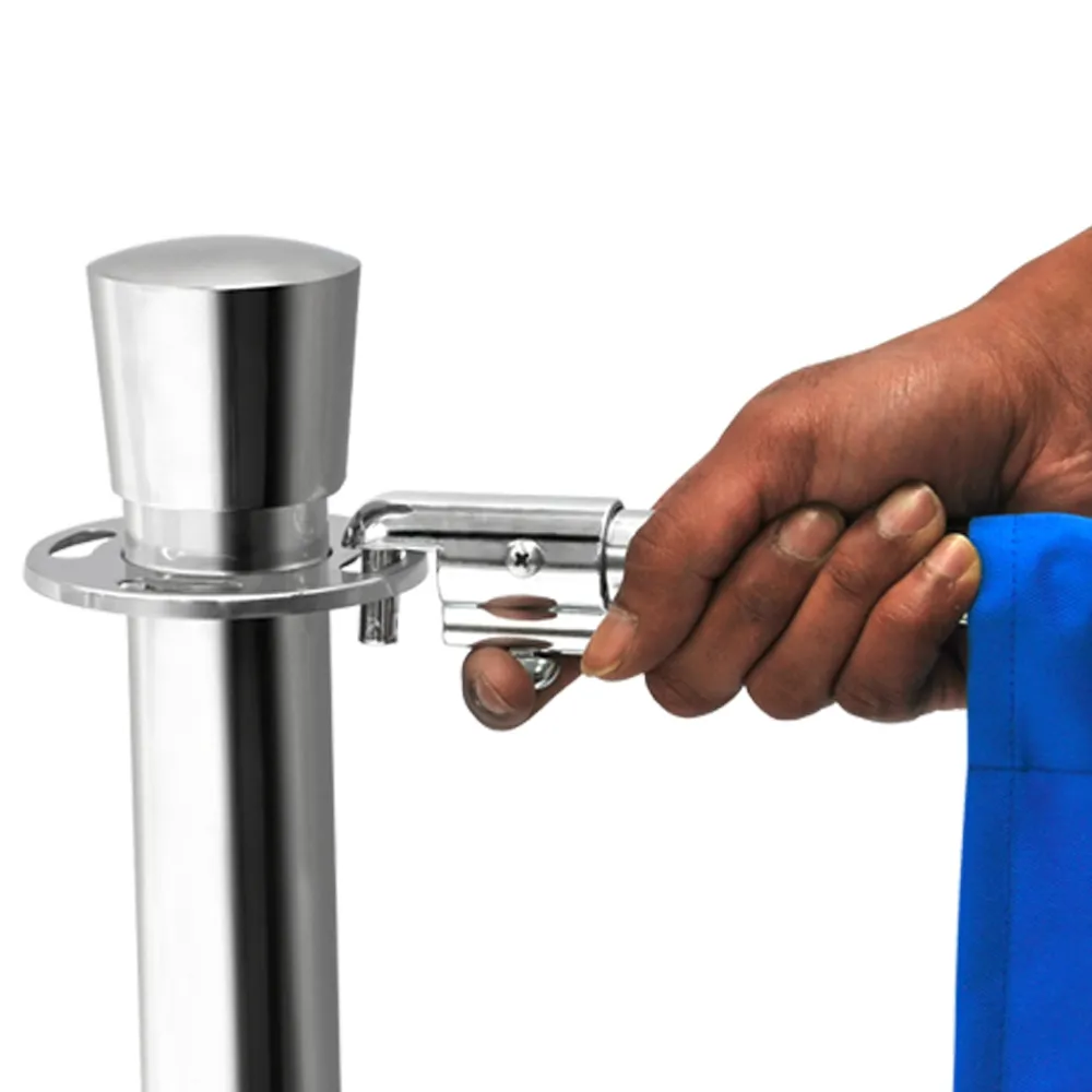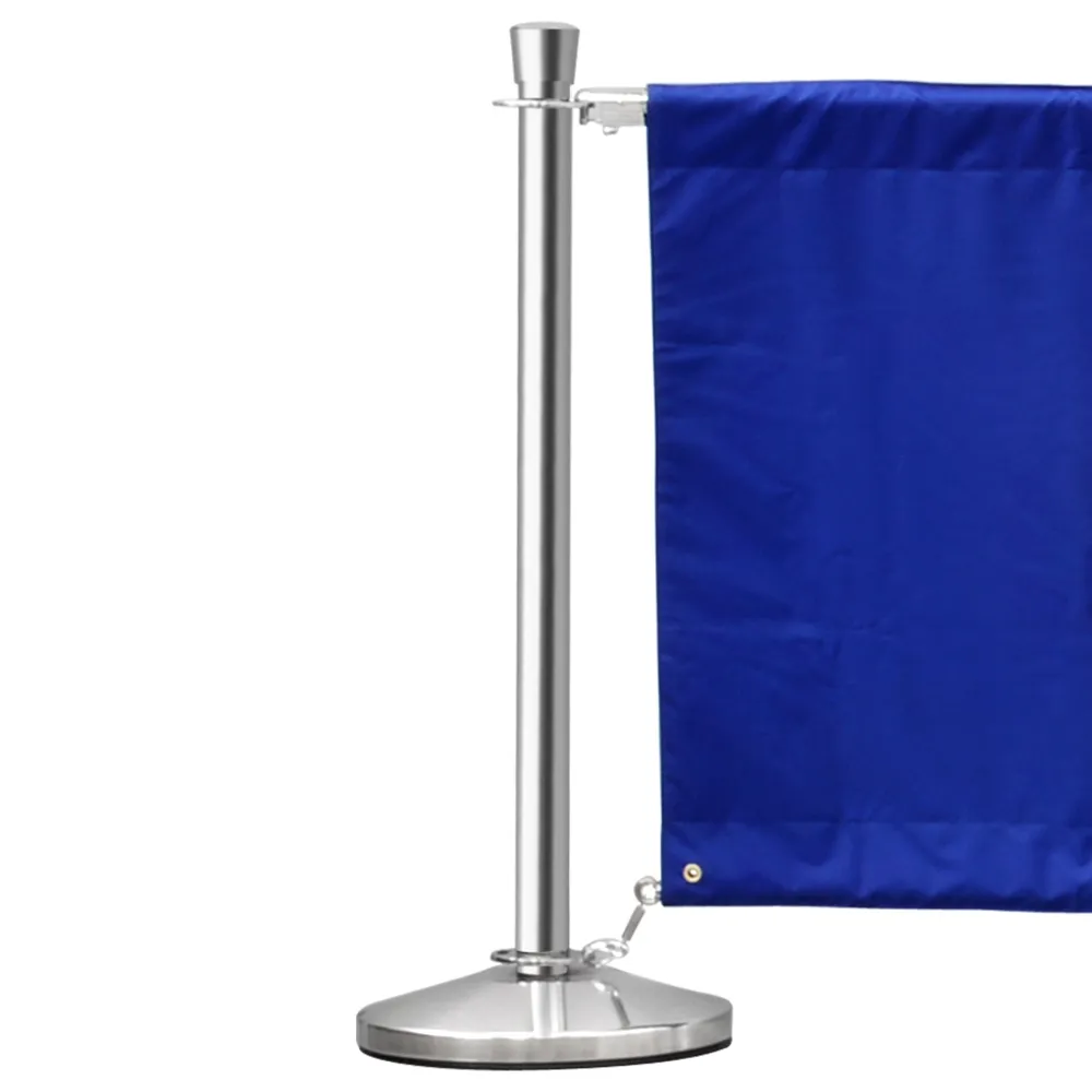 The stainless steel construction of the (8) posts have a polished chrome finish that looks great in any location. The barriers uses clips to attach to the posts, a better method than solely hooks. The included (7) banners are available in multiple colours, able to suit any decor easily. The fabric banners are used in a number of locations to create an outdoor area, including market shops and even restaurants!
