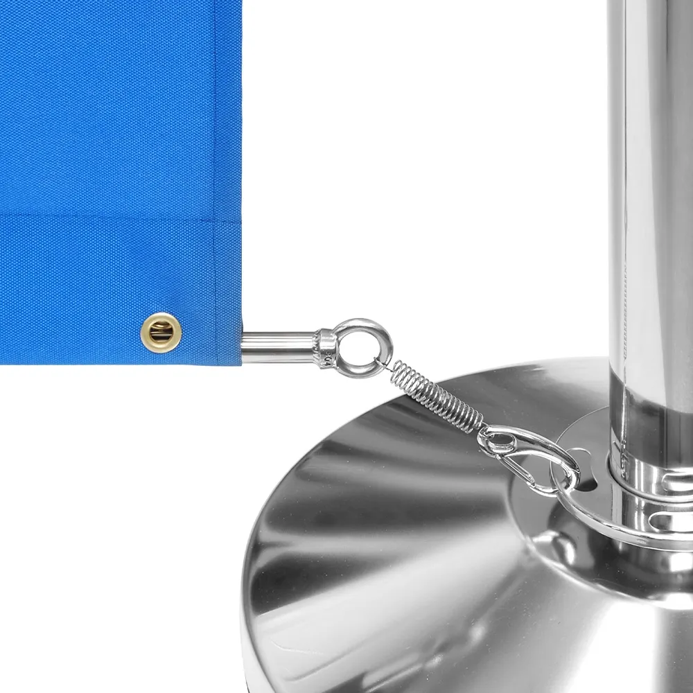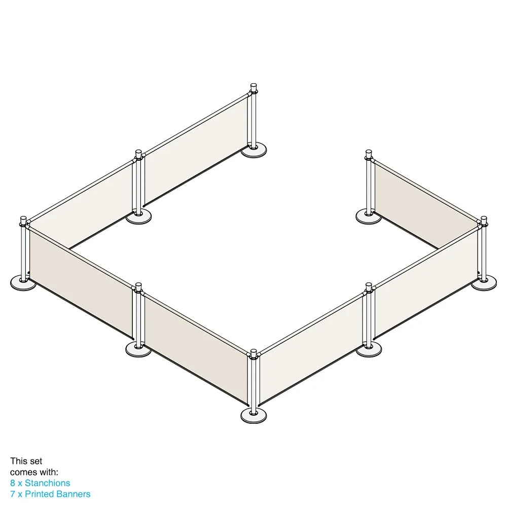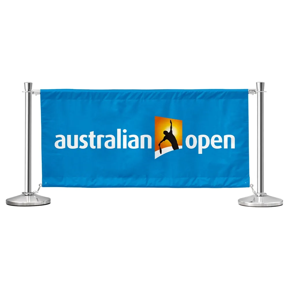 Advertising barriers are used to create seating areas, manage queues, cordon off areas, and more with your custom designs prominently displayed to help draw attention. There are (7) 1.6m long banners in this kit that are made from polyester for use both inside and outside. Your designs are digitally printed using a dye-sublimation process that offers true to design depictions of your graphics in vivid, full colours. If assistance is needed during your design process, our graphics team is available with different tiers of assistance to choose from to suit a range of needs. The banners have a channel sewn into the top to thread the stainless steel rods that attach to the stanchions securely using quick clip ends to hang the banner down. There are metal grommets on each banner as well to attach above the base using spring clips that allow movement with breezes.