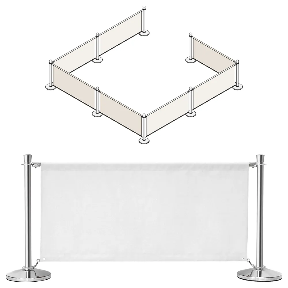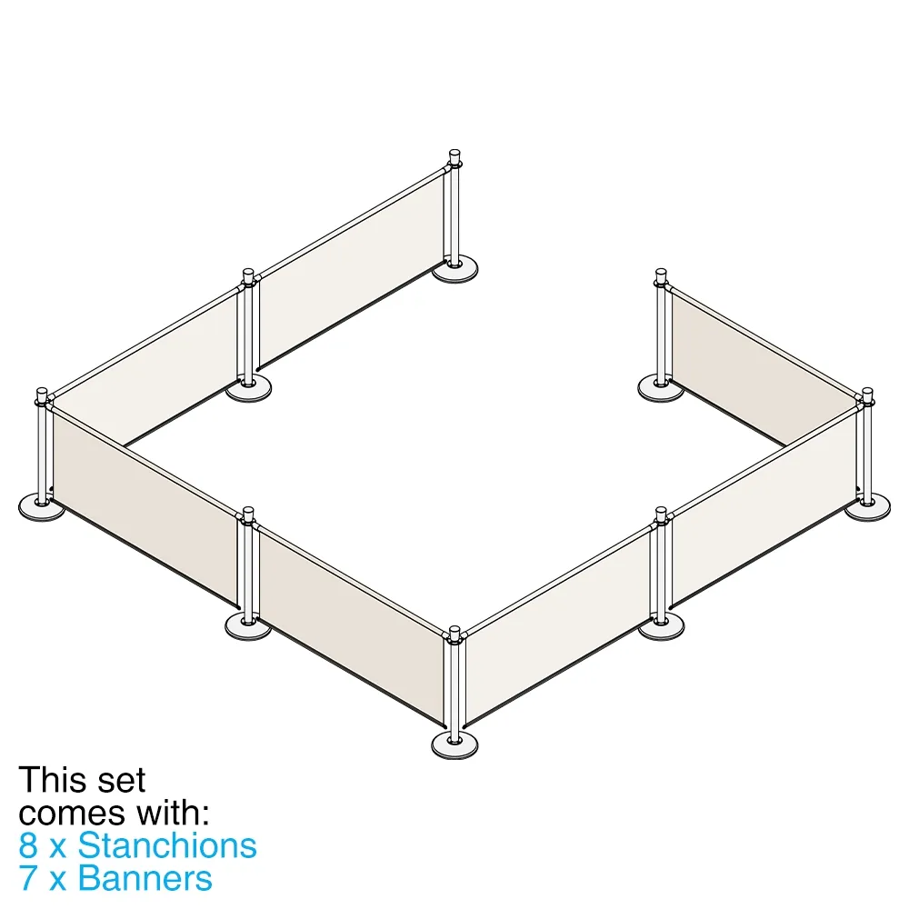 This cafe pavement barrier is a full kit included banners and stanchions to make setting up seating areas, managing a queue, or even cordoning off restricted sections simple! There are (7) total banners included that are each 1.6m long and have a channel sewn into the top of the fabric to allow the banner to hang between the posts! The banners are made from hard-wearing polyester in white for a professional look that can go with any style of décor. Metal grommets in the bottom of the banner allow it to attach near the base of the posts to prevent it from moving too far during breezes, with (2) spring clips included per banner for easy attachment. A channel sewn into the top of each banner is for the stainless steel rods to be placed through to hang the fabric from, with quick clip ends securely attaching to the barrier posts.
