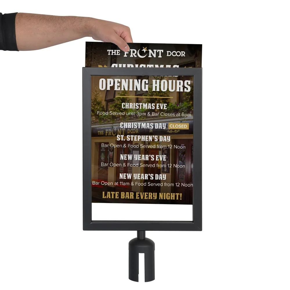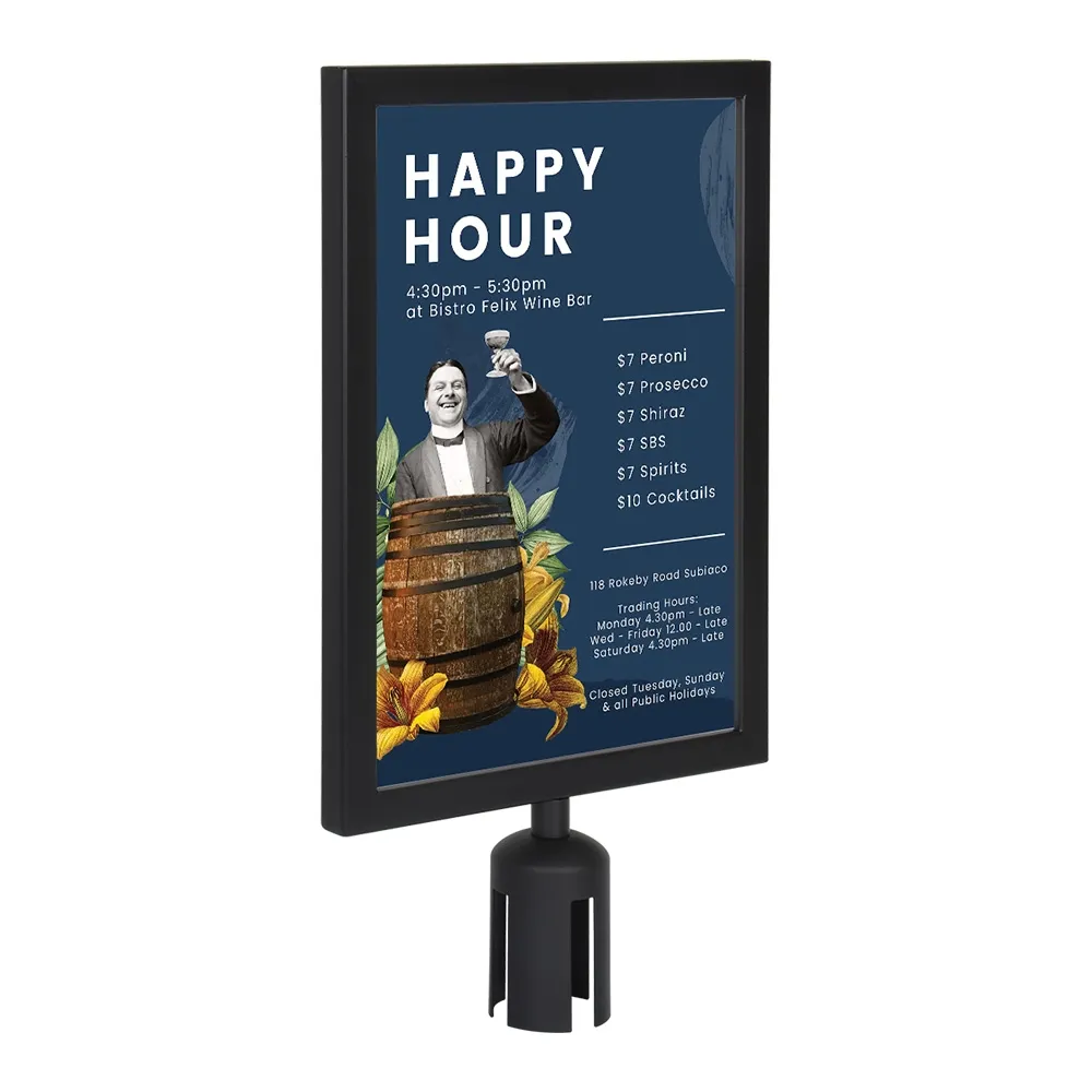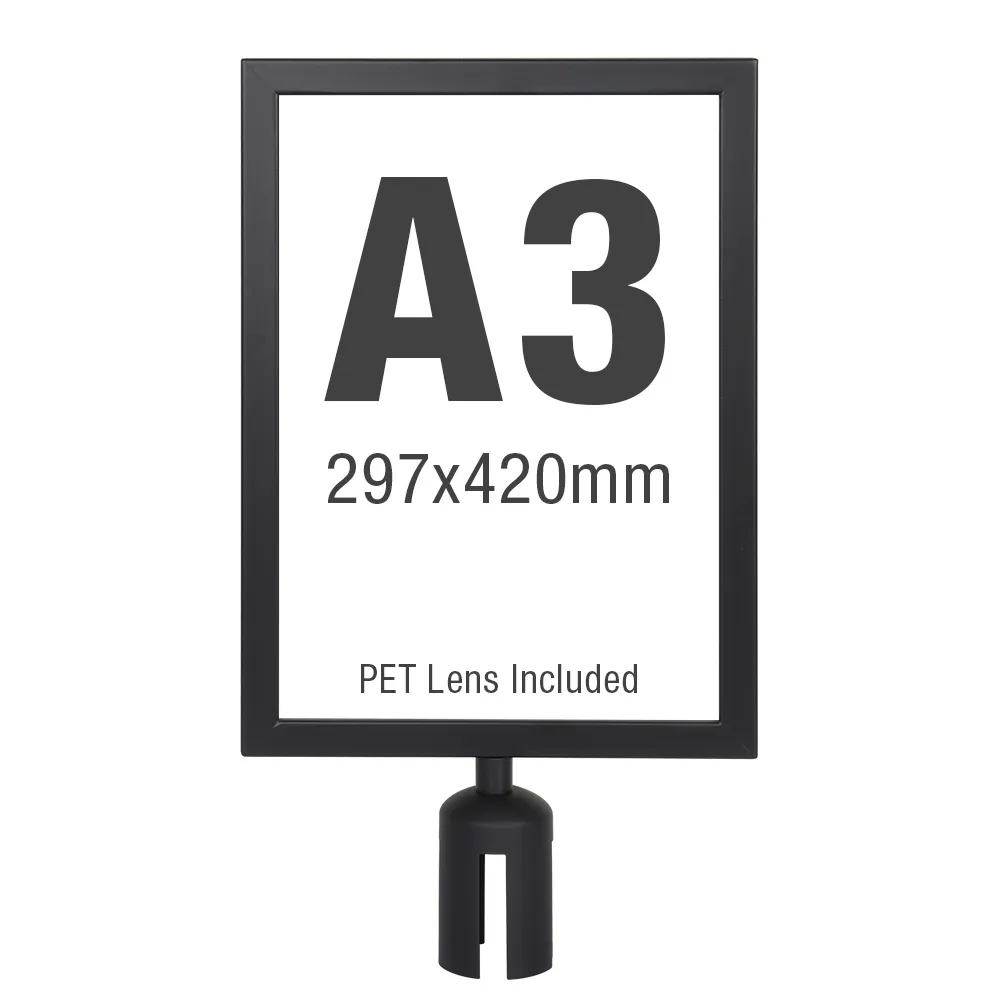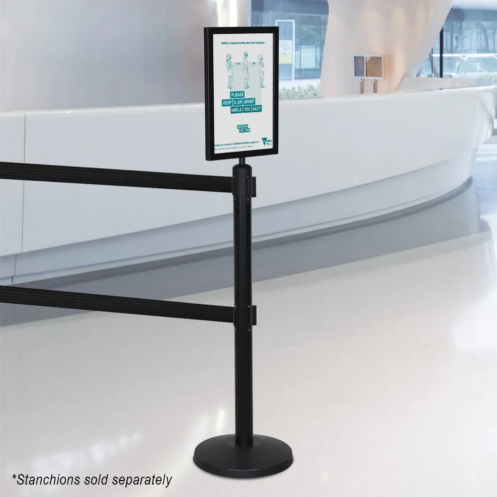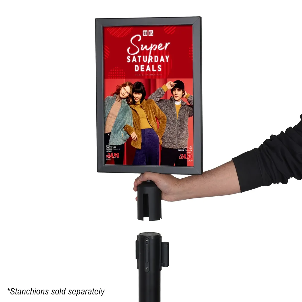 A barrier post sign frame, like stanchion signage toppers, feature a slide-in design that makes switching out posters simple. An opening in the top of the frame allows for posters and the protective lenses to be inserted with no tools needed. The frame itself is made of metal with a matte black finish that complements any colour of post. The slide in design of the holder securely attaches over the top of stanchions without restricting access to retractable belts or the connectors. Use this stanchion frame at your museum, transportation station, exhibition hall, car dealership, cinema, and more! Slimline Warehouse has hundreds of items in stock to choose from that ship fast directly to your business. Buy online today for fast dispatch to anywhere in Australia same day with this and most other in stock products!