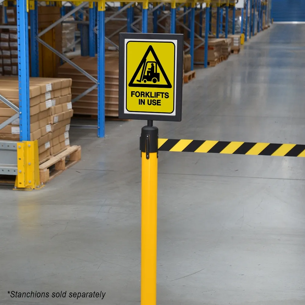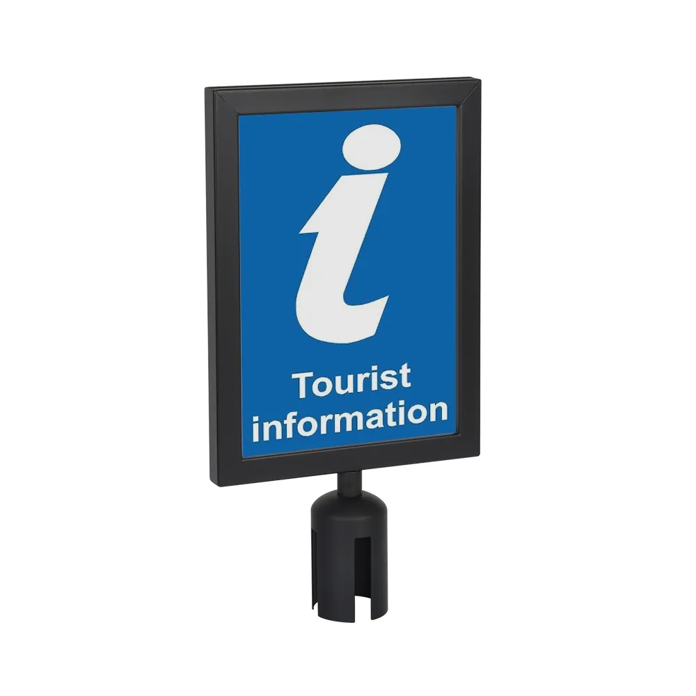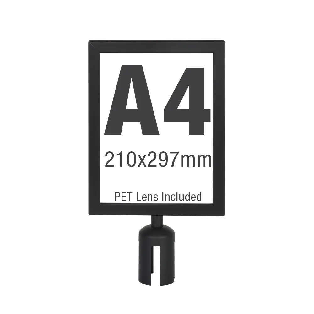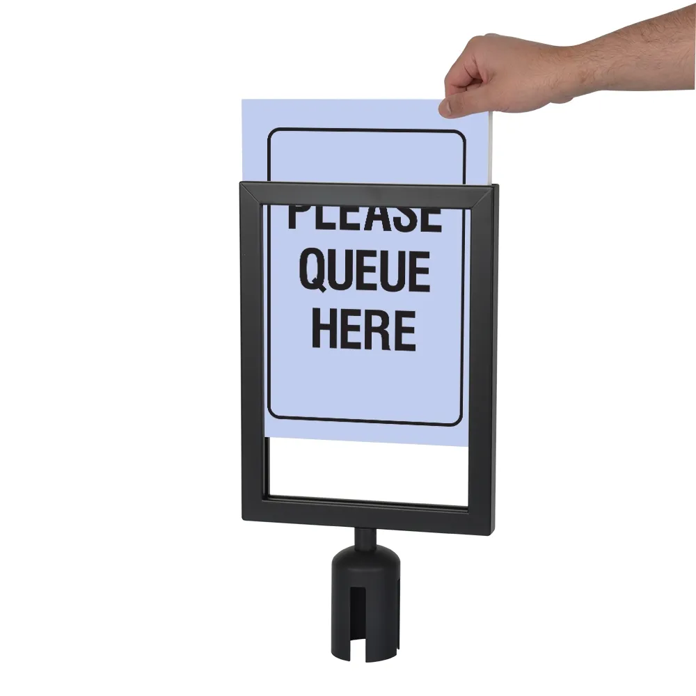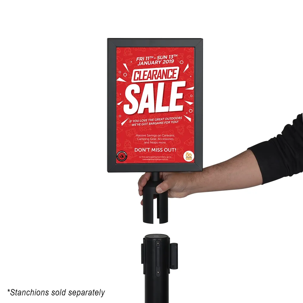 These stanchion toppers, like barrier post sign frames, are easy to install onto barrier posts thanks to the slide on design that securely affixes atop the stanchion. Cut-outs on the holder allow the retractable belt and the connectors to still be used without obstruction. The frame is made from metal with a matte black finish that complements both the décor and any colour of barrier post well. This style of display is popular for transportation stations, museums, cinemas, exhibition halls, art galleries, and even schools to utilise to manage queues or cordon off areas whilst providing information in one unit! Slimline Warehouse has same day shipping available with this and most other in stock products when purchased by 3pm AEST to anywhere in Australia, buy online today for fast dispatch to you!